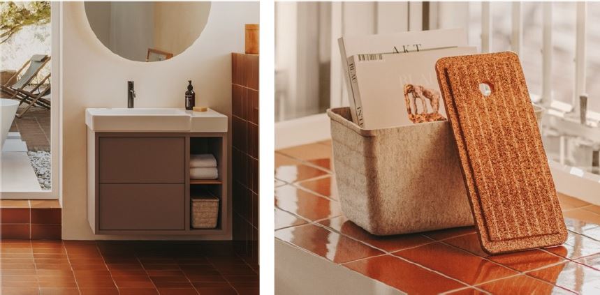 In a world where stress is omnipresent, neutral colours help create a spa-like, tranquil atmosphere in the bathroom. Shades such as soft whites, warm greys and gentle beiges promote relaxation and a sense of well-being. In addition to Light Terracotta, the Tura furniture is available in calming shades of Off-White and Light Noble Grey (shown above left). Neutral colours also provide a versatile backdrop in the bathroom, enabling homeowners to update accessories and fixtures without affecting the overall colour scheme. This adaptability is especially appealing to those who frequently refresh their decor. The Tura collection accessories exemplify this trend, as their neutral colours derive from their natural composition – recycled felt storage boxes and recycled cork lids, which also function as basin shelves.