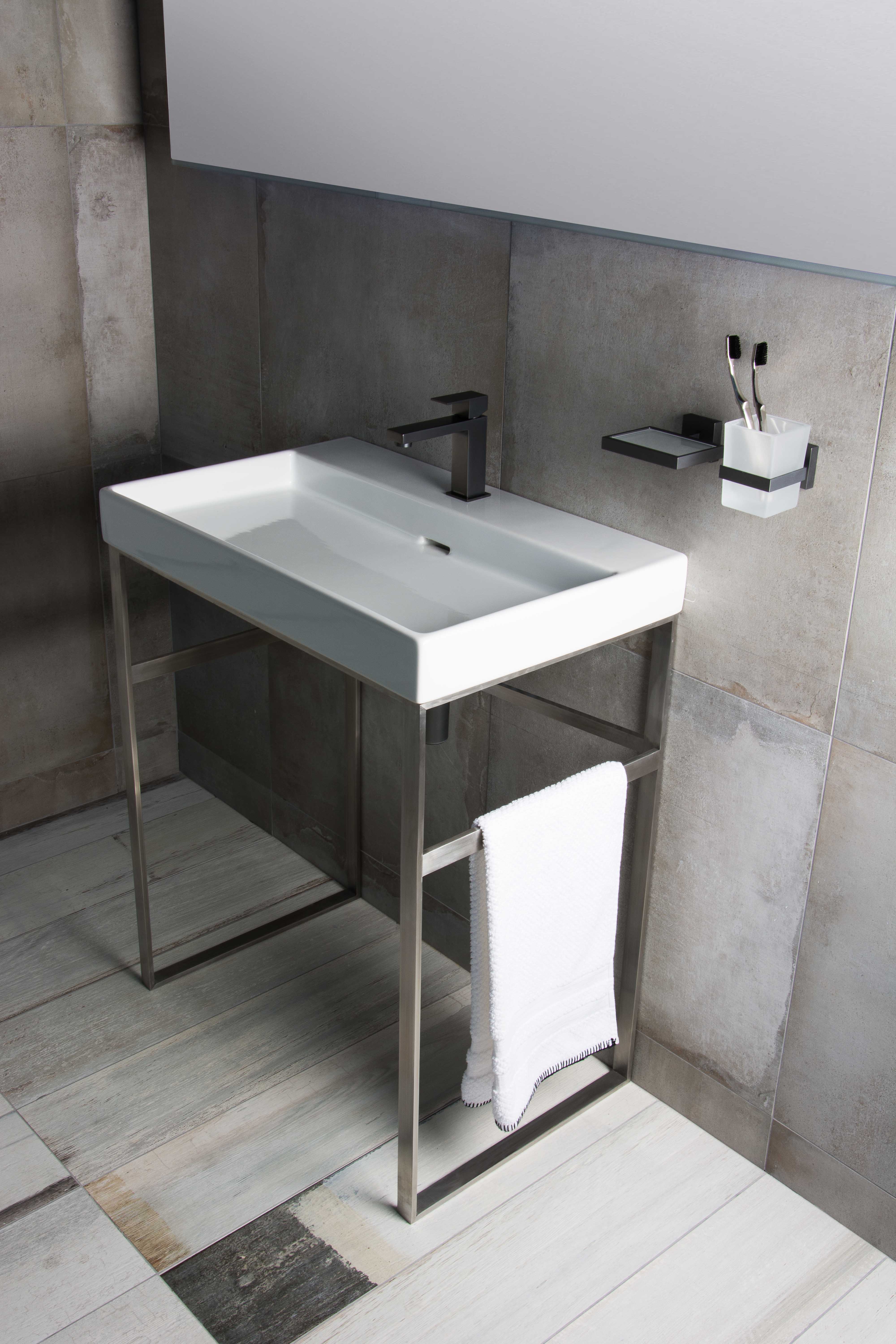 Available in a range of sizes, from 700mm up to 1700mm in width, the basin can be combined with the new MEZZANINE Basin Stand, ideal for compact bathrooms. The two side rails can be used for the convenient storage of towels, while the stand itself can be chosen to match brassware in the same style and finish, including anthracite.