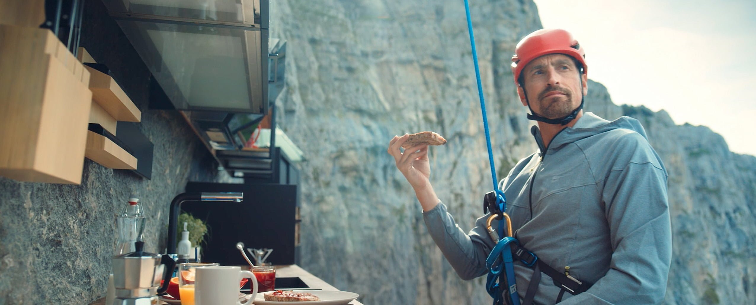 Kenton Cool, the famous English mountaineer, is the hero of this high-altitude exploit. Steeped in good humour, this adventurer, who is no stranger to extreme conditions, does just what he does in his everyday life. Just as if he were at home, Kenton goes from the kitchen to the wardrobe, but at an altitude of nearly 2,000 metres! Everything seems simple for this athlete who is used to climbing the highest peaks.