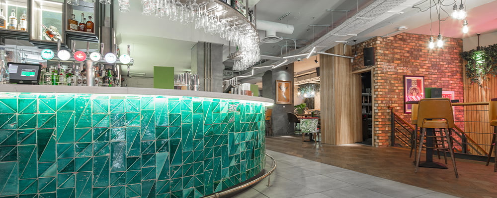 Found on the walls of the impressive front bar, Harrison commissioned a handmade bespoke ceramic tile in a geometric pattern of colour-matched green tones. The walls of the toilets feature a specially sourced botanical pattern ceramic tile joined by colour-matched green ceramic wall tiles in a gloss finish.
