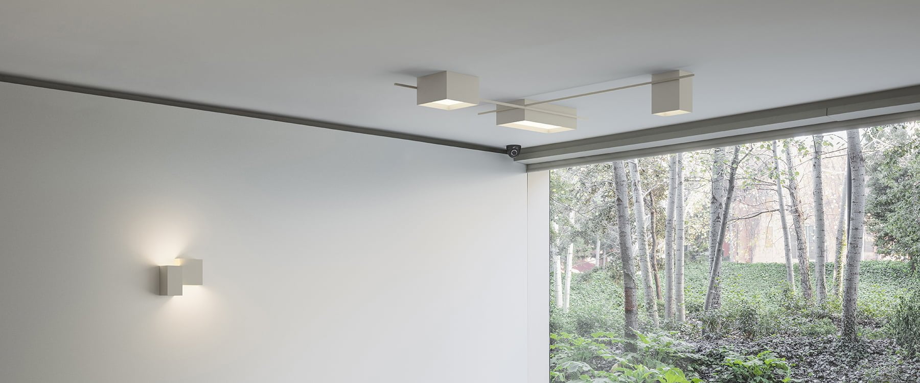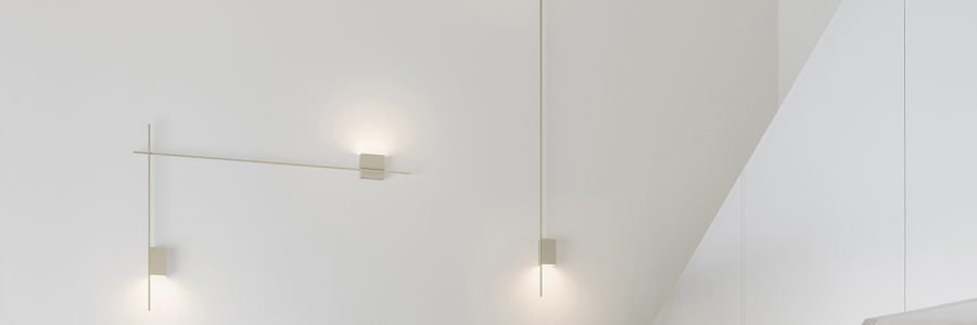 For the compact wall lamps the assemblage of displaced parallelograms frames the bi-directionality of the light beam with a powerful effect. For the larger versions the wall planes are highlighted with a luminous effect that establishes an ambience of lighting inter- connections: Intimate and yet large scale. The ceiling lamps express a poetic rationalism.