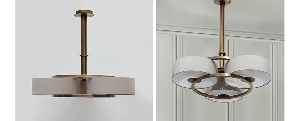 The Pentland Chandelier’s triple shades are available in a choice of colours and fabrics. The curving motif of the design is highlighted with the decorative brass centre and opal diffusers of the shades.