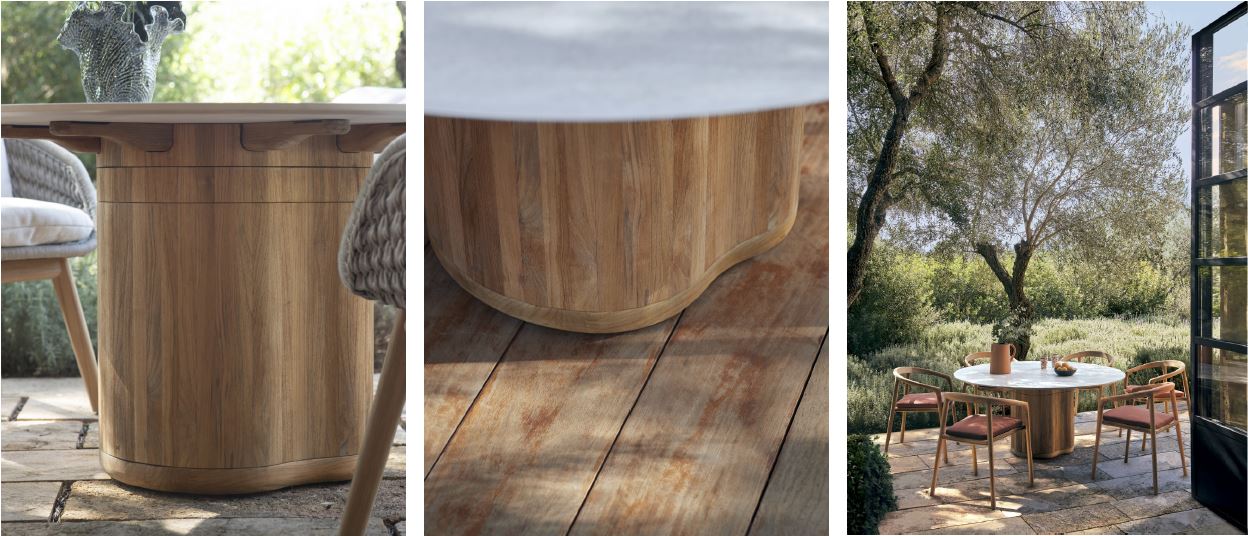 Its smooth, circular tabletop, available in luxurious ceramic or warm teak, invites intimate conversations and shared meals. The table’s base, crafted with meticulous attention to detail, features a sculpted design that reflects the organic lines found in nature, seamlessly connecting the tabletop to the ground. Experience the joy of gathering around a table that embodies both style and comfort, perfect for creating lasting memories.
