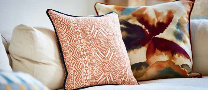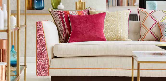 The prints include overlapping, ikat-edged disks, overblown abstract water colour flower-heads and a ‘ribbed effect’ stripe; they achieve a sophisticated nuance of shade and tone through layering, further enhanced by a polished chintz finish. The graphic-look jacquard features distressed, almost pixelated lines and embroideries include zingy, multi-coloured narrow chevrons, triangles forming stripes and a mosaic tile effect.