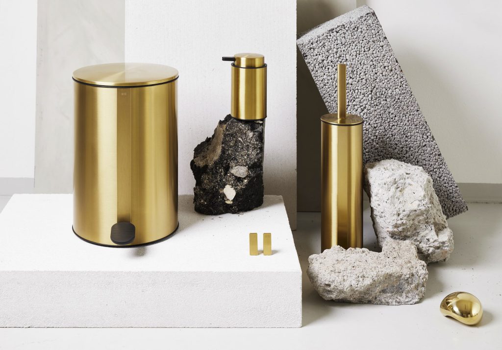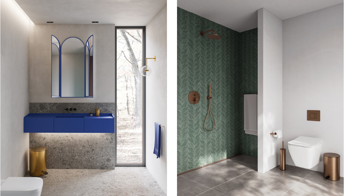 Left: Unidrain Reframe pedal bin, soap dispenser, brass blue wash basin. Right: Line Bespoke HighLine Reframe pedal bin, toilet brush, copper