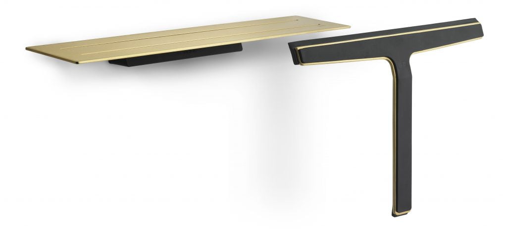 “In the bathroom, the brass elements were selected to created a delightful contrast to the muted colour scheme. The golden tones are present in the linear drain and shower shelves by Unidrain.”
