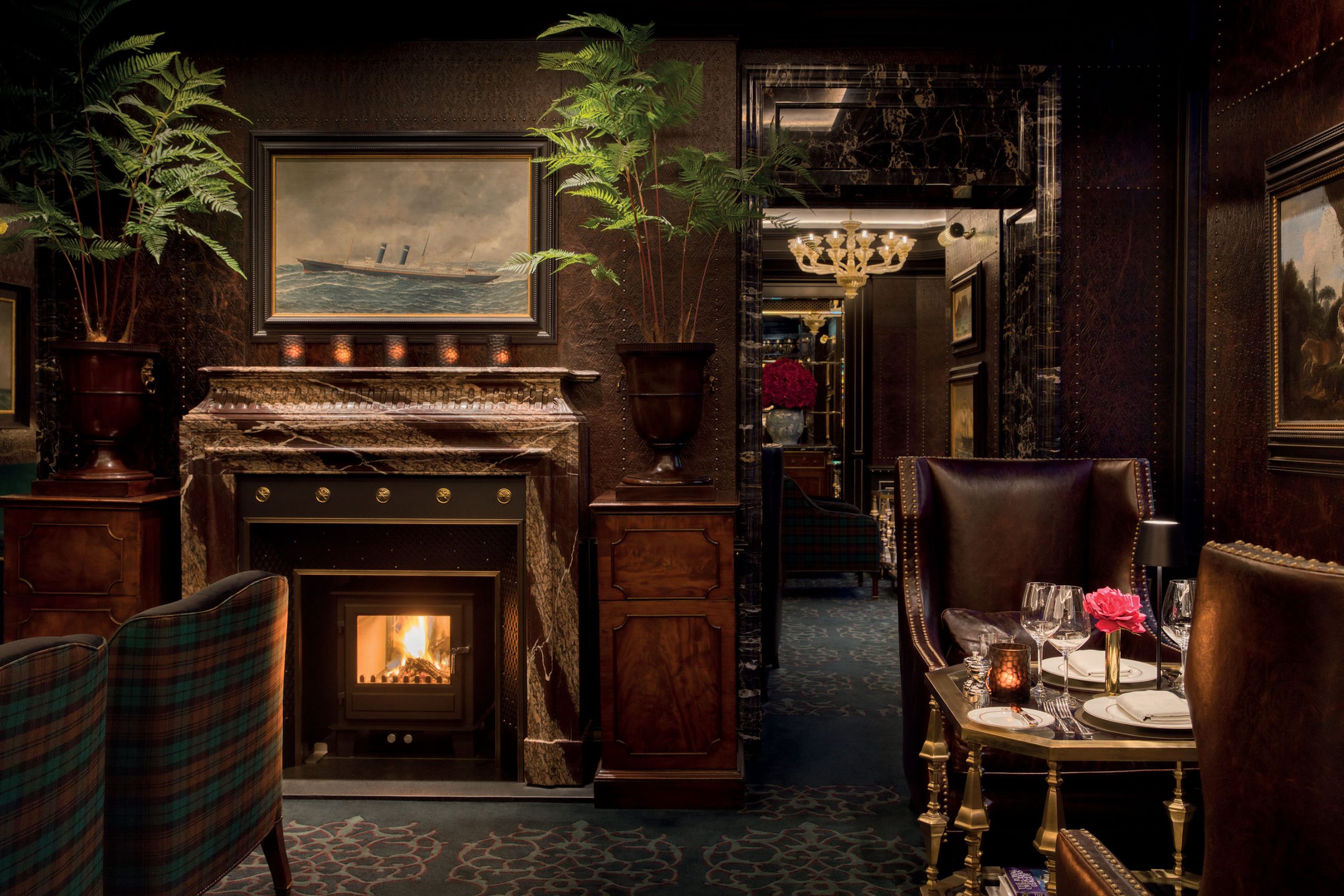 In The Wallace, an impressive model ship commands an entire occasional table set among the inviting array of squashy armchairs and sofas clustered around low tables.