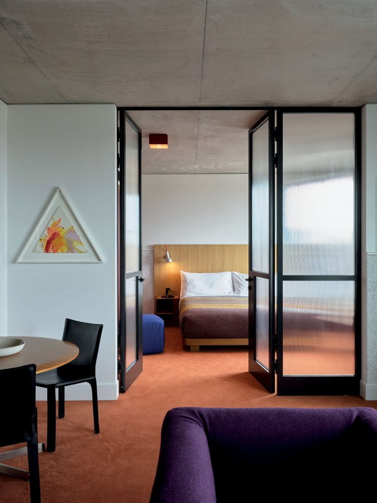 The custom joinery and furniture give the rooms a residential feel, while the nuances between the heritage building and the new addition mean rooms are unique in detail and character. In the rooms on the lower levels, exposed brickwork is seen, while the newer levels have terrazzo flooring. Some of the rooms have terrace balconies – a result of the vertical tower addition – while others feature historic bay windows overlooking Wentworth Avenue to the east, or oversized steel and glass factory windows overlooking Foy Lane to the west.