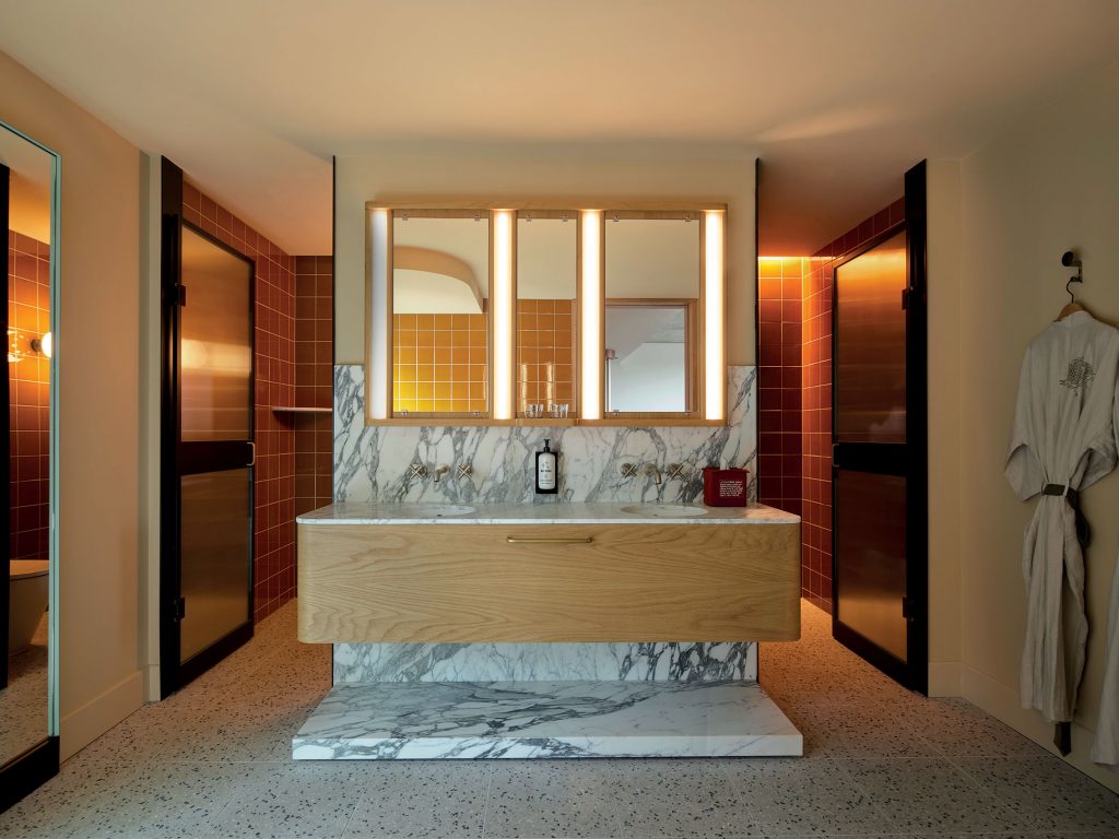 Nearly all the furniture and lighting in the hotel is custom-designed by Flack Studio and its collaborators – from the banquette seating to the beautiful sconces. Iconic modernist designs include lighting by Isamu Noguchi, Tobia Scarpa’s Nuvola lamp and select vintage chairs. In keeping with the building’s design, the materials are raw yet refined, with a modern edge – armchairs and stools of oak accented with green velvet or black leather, marble tabletops and linen lampshades.