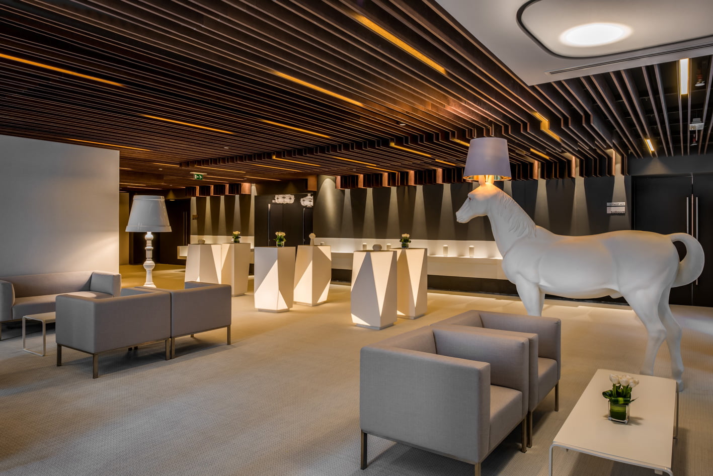 Customised, out-of-scale, standing stage projector lights have been deliberately positioned in the main lobby to immediately provoke a ‘theatrical’ feeling as soon as one enters the hotel.