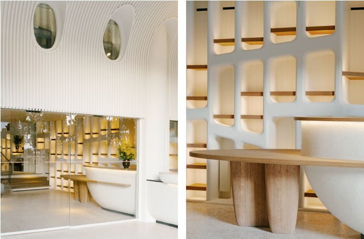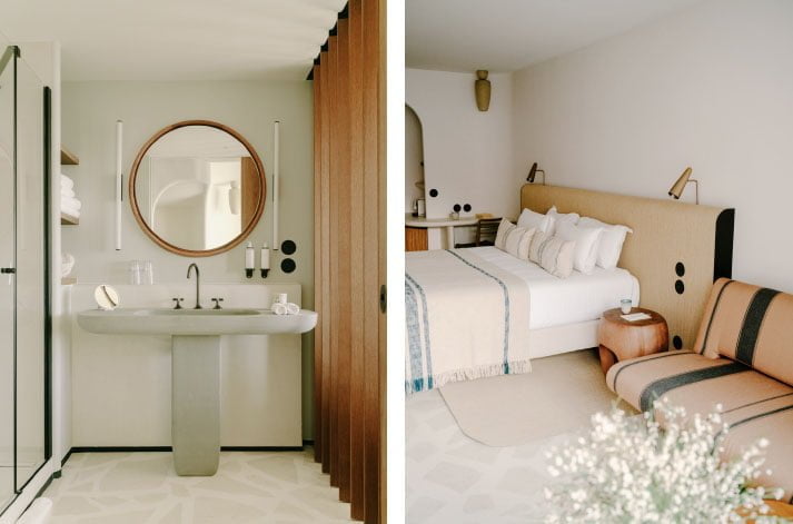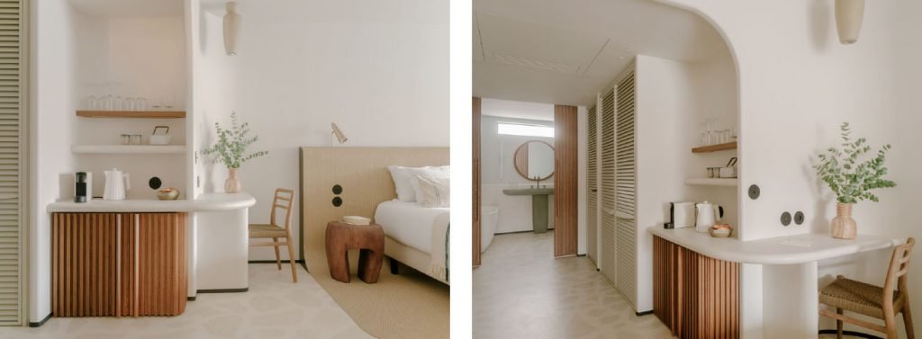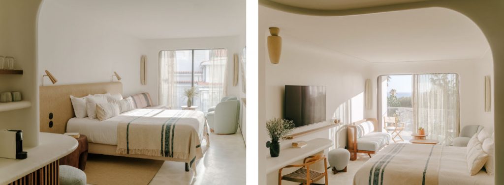 Behind its futuristic undulating façade, this immaculate colossus was entirely conceptualized by designer Raphael Navot (Hôtel National des Arts et Métiers, Le 39V, Silencio, etc.), famous for his dreamlike avant-garde universe, backed by the FAAR Architects studio. Here, this figurehead of contemporary design delivers his elegant interpretation of the French Riviera, with a focus on natural materials such as wood, stone and terrazzo. Plaster, a steadfast, century-old staple of coastal hotels, also makes a generous appearance. The site is intended to blend in perfectly with the landscape and colors of this area of Cannes, which is more untamed than the Croisette. Between land, sea and sky, the red- and rust-toned brick roof brings to mind the fiery shades of the Esterel mountain range. The fifty rooms and ten private residences, including one penthouse, are adorned in deep blue like the sea, along with pale organic sand hues. Entirely custom-made for the hotel, the timeless furniture fits effortlessly into the different spaces: the bookcase with its ocean coral shape, the linen-covered beds, the canework chairs, the woven rugs, the dark wood nightstands, and the minimalist lighting fixtures carefully selected with Florian Duet, delicately positioned on the walls. A resort cocoon bathed in light that also features a beautiful Mediterranean garden filled with palm and pine trees, orchestrated by landscaper Gwenaëlle Grandjean and the Saint-Lazare agency.