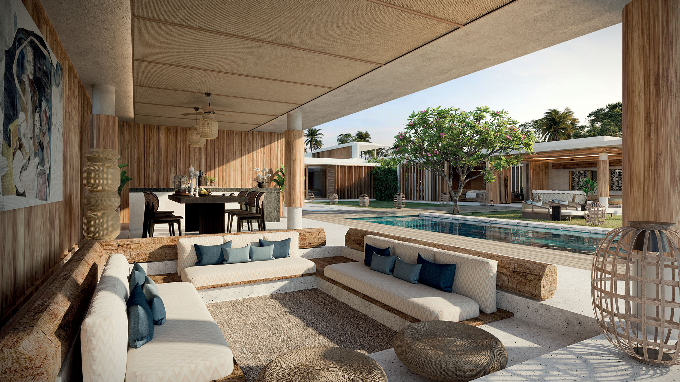 In all rooms, guests remain connected to the local area with hand-carved wooden headboards showcasing geometric symbols from Sumba ikats and additional bespoke furnishings in locally sourced rattan, bamboo, and teak. Terrazzo, polished concrete, and natural plaster restore a balanced sense of contemporaneity, alongside tables by designer Sarah Ellison and fabrics by Pierre Frey. A custom room fragrance and bath amenities were developed by Grasse-based perfumer Gerard Gatti, and Cabas bags designed by sustainable luxury brand Stelar are also placed in each room for guests to use during stays.