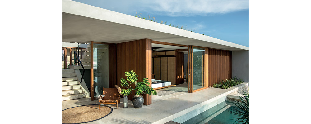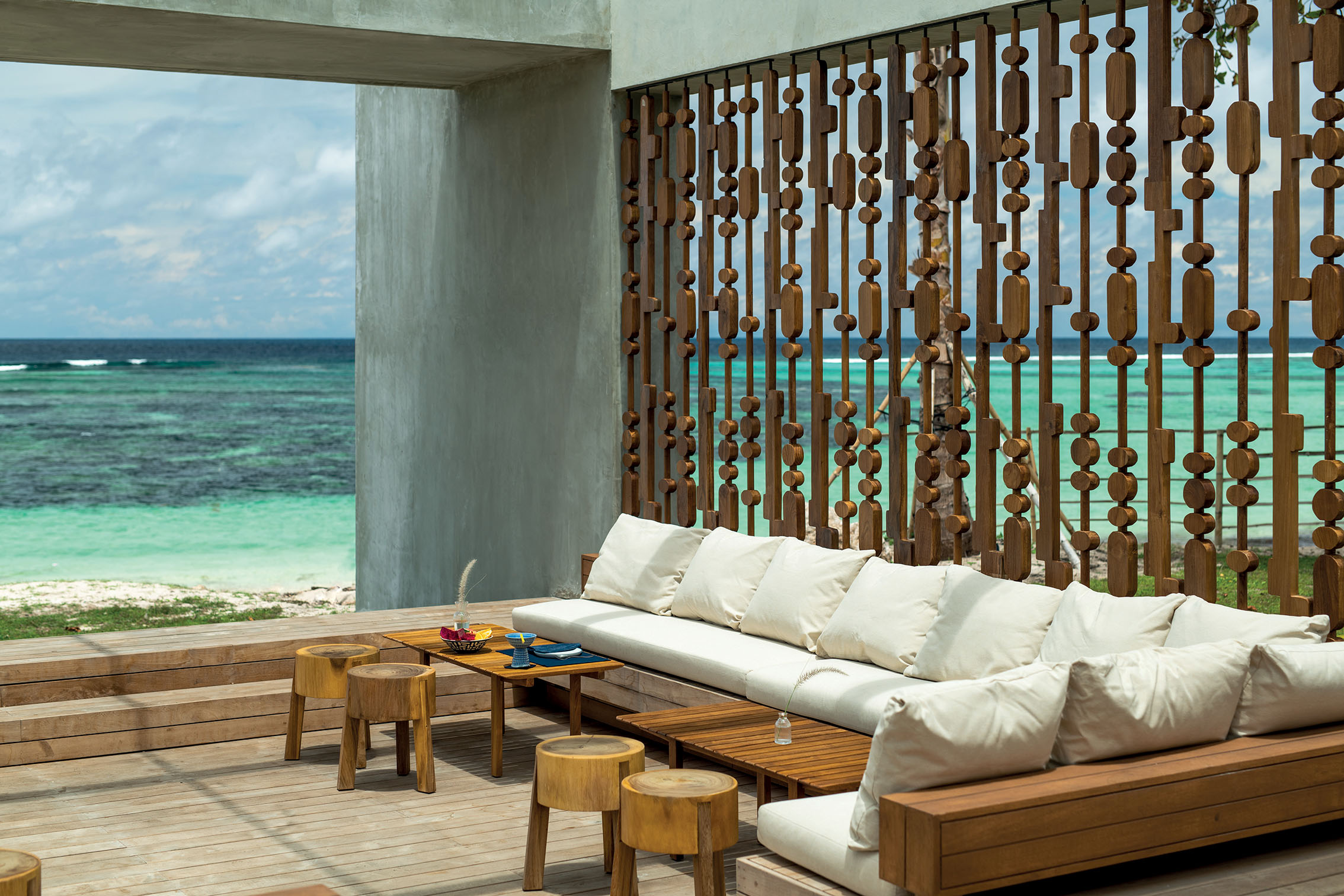 Led by Gary Fell of GFAB Architects, the resort’s architecture is a contemporary tribute to tradition. Clean lines and modern simplicity are combined with five buildings constructed like a Sumbanese village at the centre of the footprint. Fell’s approach to the structures are complemented by Jakarta-based Bitte Design Studio’s interior concept, which fuses contemporary aesthetics with pieces created with age-old craft techniques by local artisans. The reception and lobby area feature a cotton wall-hanging by Sumbanese master weaver Kornelis Ndapakamang, travertine blocks that reimagine Sumbanese megaliths, and bespoke teak and rattan furniture made with materials sourced from within Indonesia. Colourful custom tiles by Gaya Ceramic and geometric wooden pillars by Kalpa Taru Bali also appear in the hotel’s Beach Club.