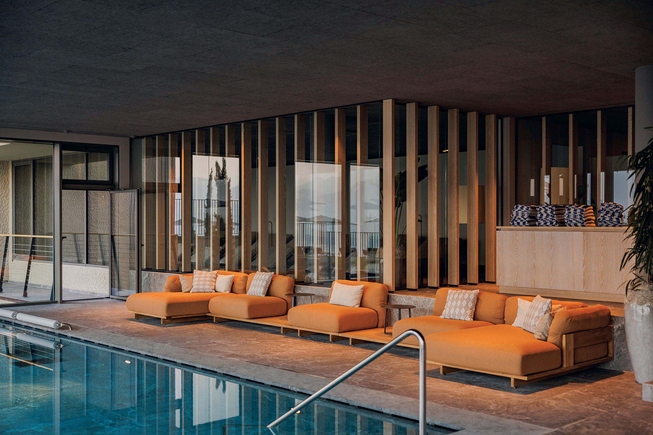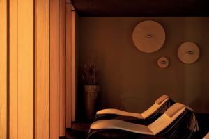Throughout the property, the connection between indoor and outdoor spaces is upheld seamlessly. Underscoring this is the infinity pool, which crosses the building’s threshold. Indoors, I stepped into the warm water, swam up to a low door that swung open as I approached and then continued outside to swim amid the crisp fresh air, with the mountain landscape ahead.