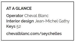 There’s a distinctive casual-chic atmosphere that combines relaxed elegance with refined luxury. As Gathy said: “Elegance doesn’t come from wearing high heels; on vacation, it’s about being sophisticated yet relaxed. It is this type of casual-chic atmosphere that I have tried to translate at Cheval Blanc Seychelles.”