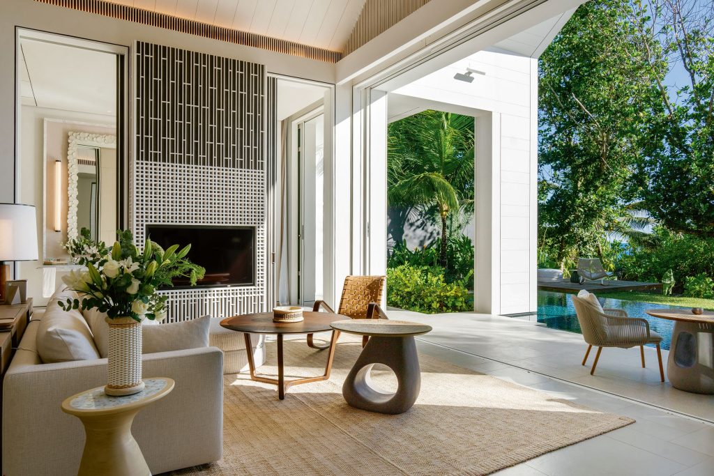 The villas epitomise a harmonious blend of sculptural finesse and airy openness, characterised by expansive spaces, natural illumination and lofty dimensions that foster a natural sense of ease. From the sculptural communal areas to the illusion of suspended ceilings created by sliding, baseless windows, Gathy’s design invites guests to unwind and be immersed in the tropical environment without forsaking sophistication – a defining feature of casual-chic living in the Seychelles.
