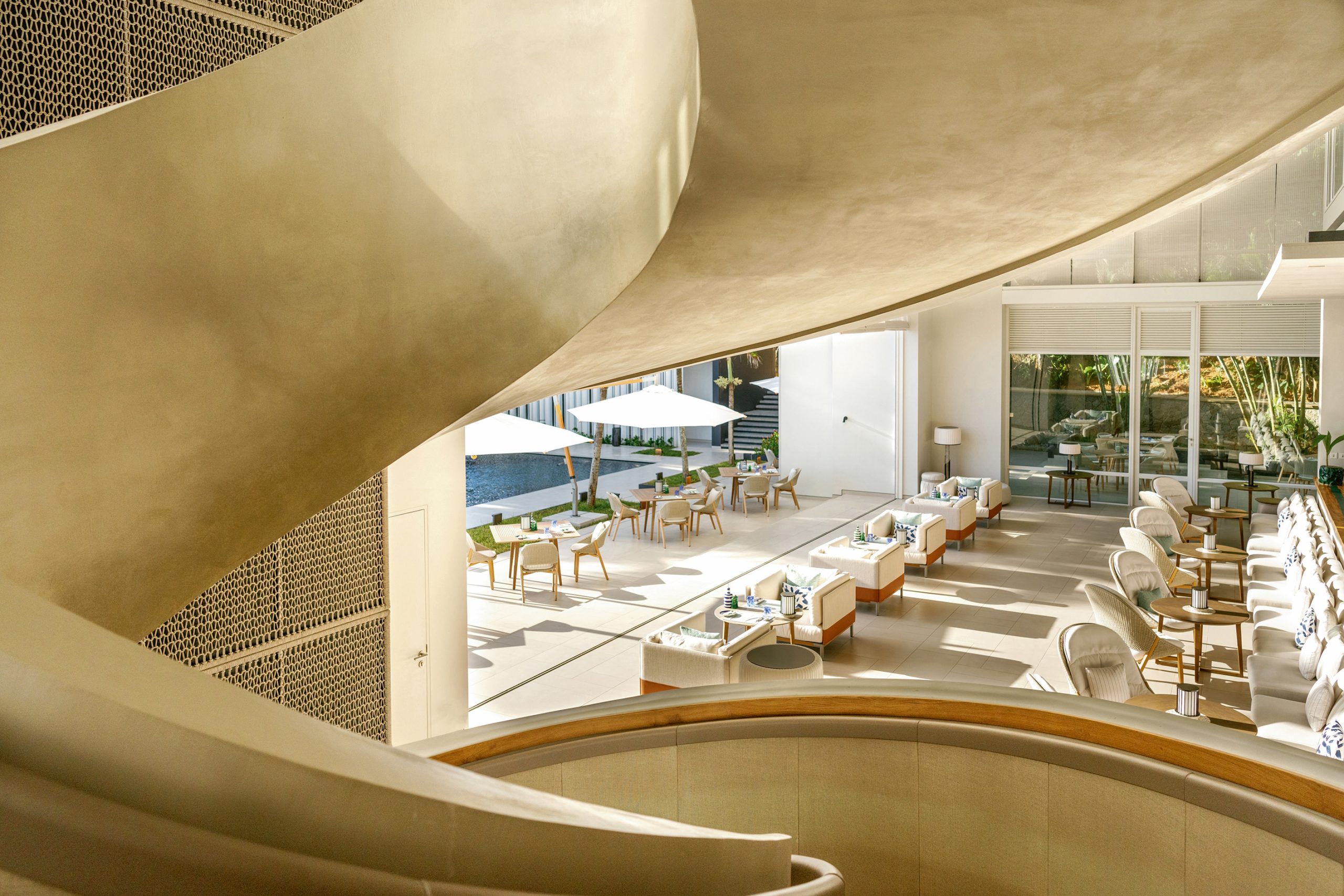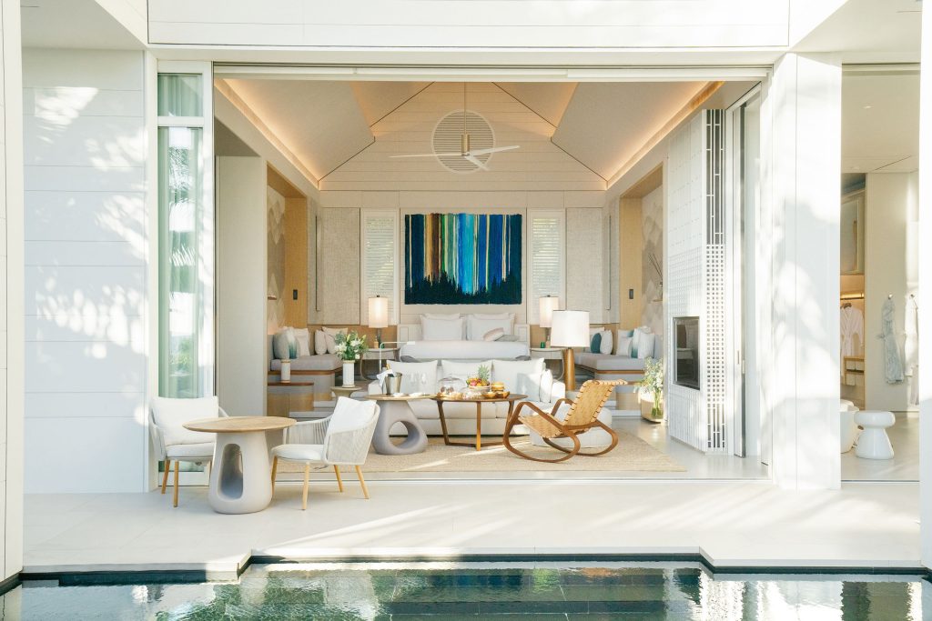With a colour scheme of shades of white, sand and greige, the refined villas blend harmoniously into this place where the optic white of the sand, the dark grey of the volcanic rocks and the deep green of the vegetation mingle. Rather than vying for attention against the captivating backdrop, the villas’ design ethos prioritises refinement, comfort and aesthetics, embodying a subtlety that complements the natural splendour of the surroundings.