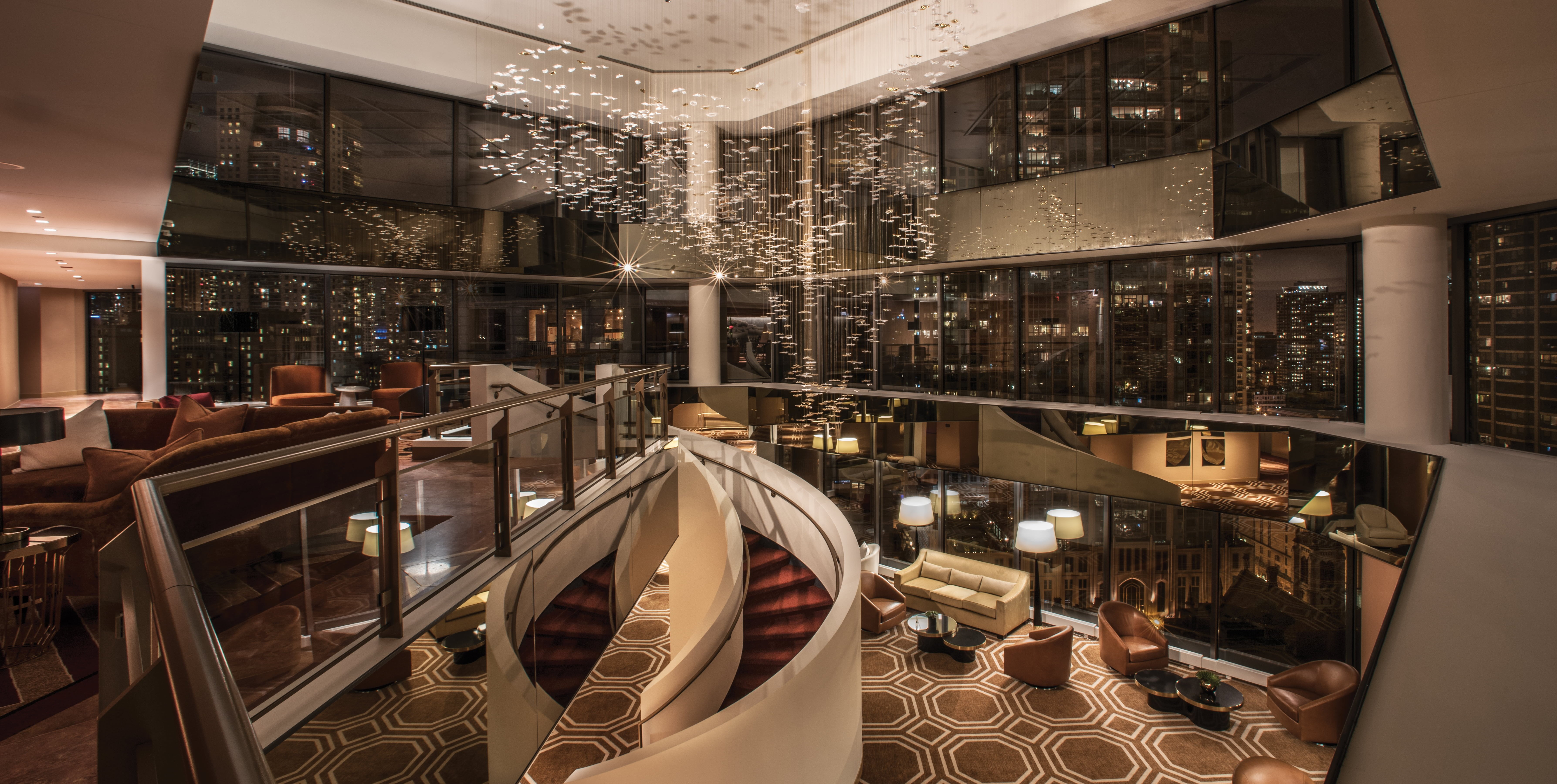 The hotel’s most remarkable feature is the dramatic two-storey atrium located on the 19th and 20th floor. An eye-catching porcelain and gold leaf-inspired sculpture suspended from above grabs your attention, with a backdrop of Chicago’s glittering skyline. Supplied by the British company Haberdashery, the sculpture is named Inoca and makes reference to leaves caught in the Lake Michigan breeze, offering a gentle nod to the Windy City. You first see Inoca upon entering the atrium before it ascends to the hotel sky lobby on the 20th floor. Displaying 1,300 fine bone China leaves, the form appears to be floating in front of the two-storey, floor-to-ceiling windows. Mirrored panels further contribute to the spacious feel.