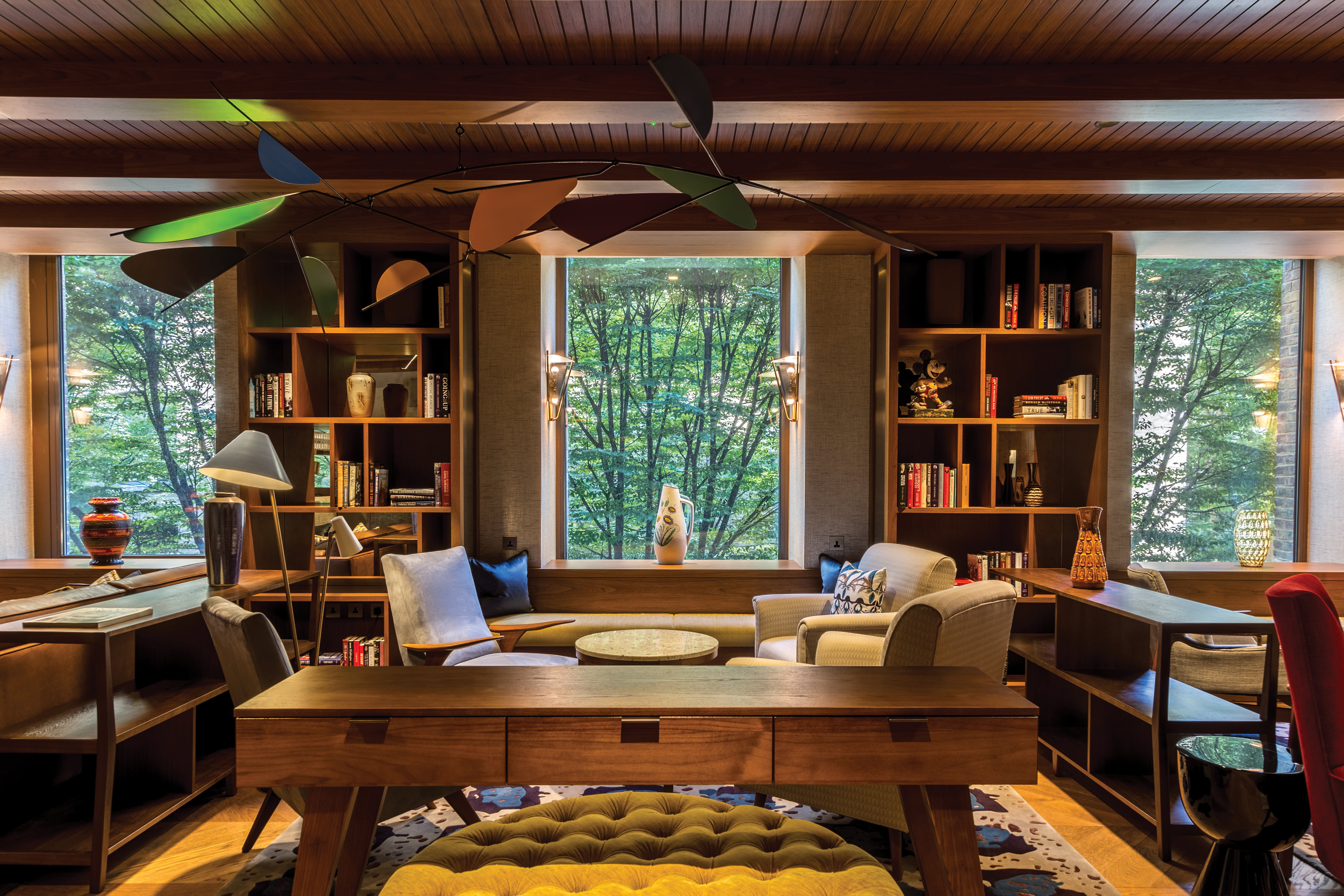 Taking the lifts up to first floor, to the designated members areas, you walk into the causerie, which basically feels like walking into someone’s home. Still amazingly luxurious, there is a cosiness to it that is hard to create in such a large space. Colourful and playful, it has Alexander Calder-inspired installations hanging from the ceiling and elegant furniture.