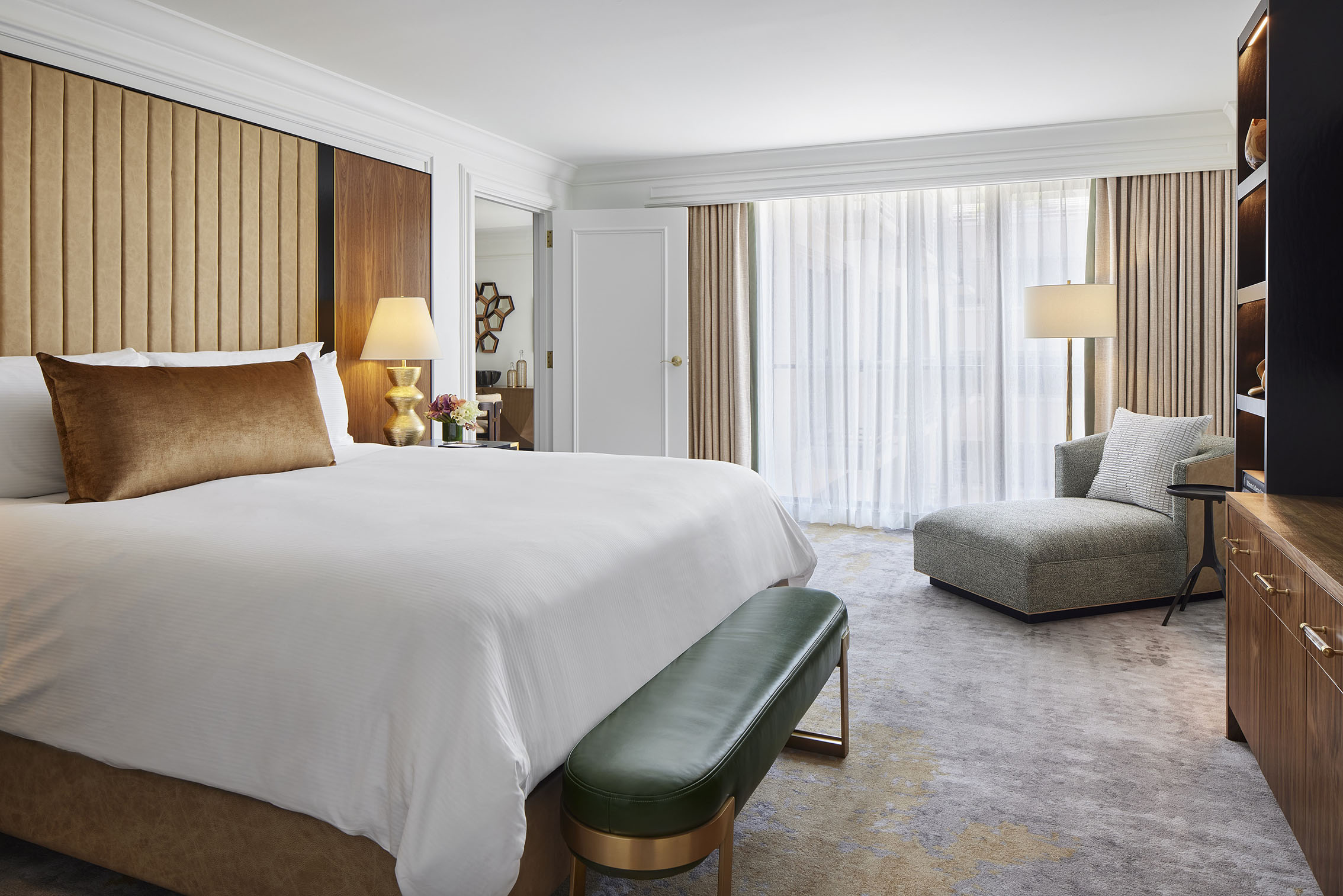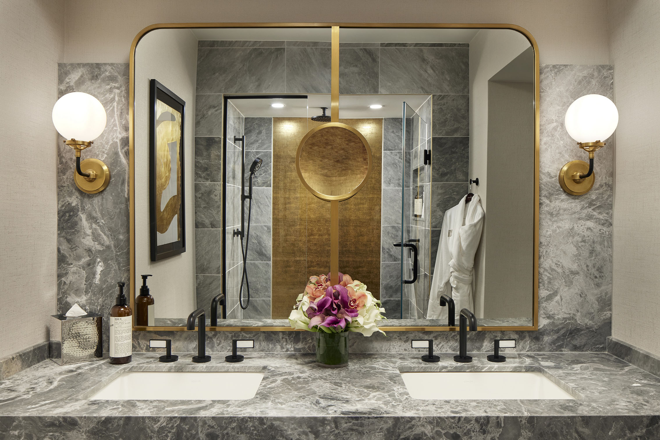Fairmont DC is an oasis in the city centre. Inspired by its grand architecture and lushes’ parks, the renovated suites provide the ultimate escape to unwind and relax. The colour scheme is fresh and bright to maximise the natural light, the walls in the living room and bedroom were painted white with additional wall trims for an elevated look. By contrast the entries received a dark stained wood floor and gold wallcovering for drama. All new rich walnut and natural stone millwork, plush inset carpet paired with new furniture in neutral and green accent fabrics provide a soft and residential feel. All bathrooms are fully renovated with white or grey marbles and new vanities for a spa-like experience.