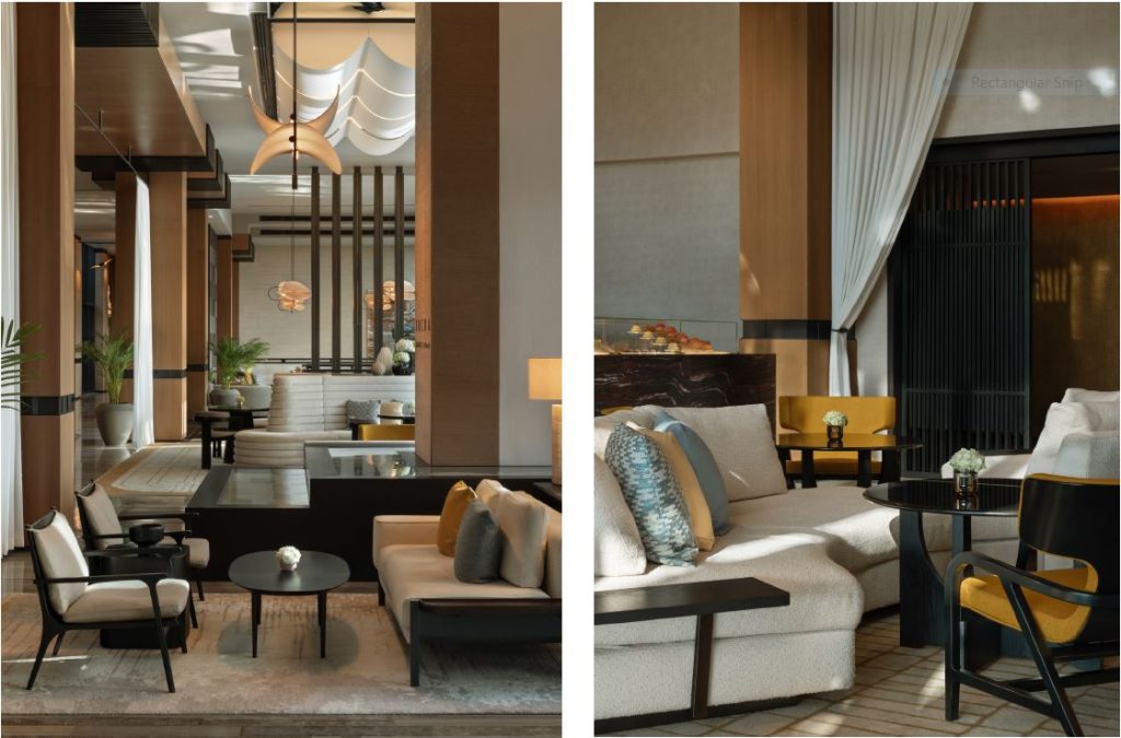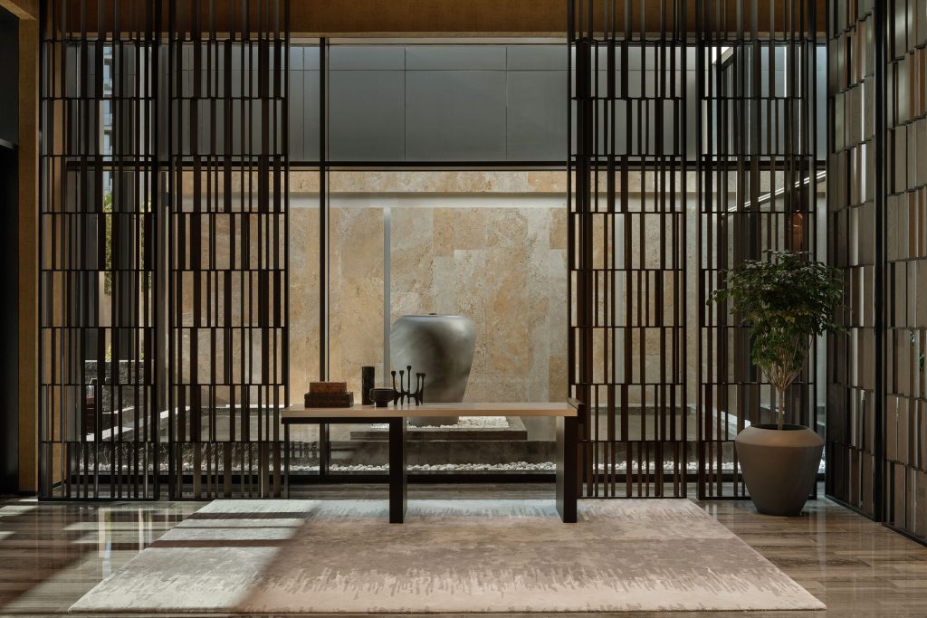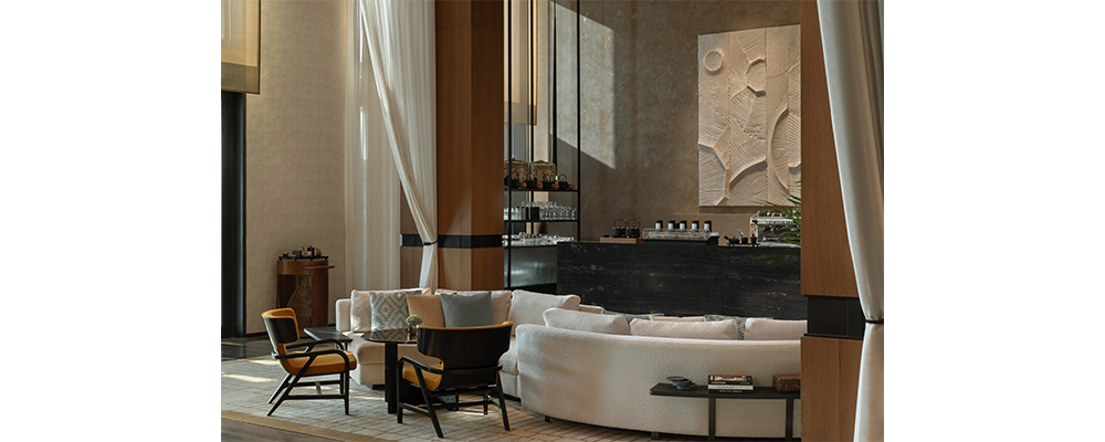 Inspired by desert landscapes, the lobby becomes a modern mirage: soft lighting, filtered through sheer drapery and ceiling coves, is enhanced with materiality and spatial layering. “There’s an immediate sense of calm and retreat,” added Nagata. “The arrival experience – defined by softly screened partitions – creates a gentle transition from the fast-paced city outside to a tranquil sanctuary within.”