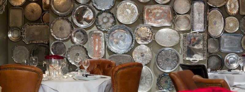 The real focus in the restaurant, aside from the food, is on the walls. Shiny silver platters and blue and white vintage china covers the walls in a whimsical display, while an elaborate Florentine mirror reflects the abundant light from the large windows. Leather Mimi dining chairs are mixed with tufted Chester dining chairs for a classic comfort.