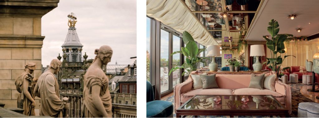 An all-in-house feat, the team at Ennismore interior design and architecture studio, AIME, led by Charlie North, have spent the last five years sensitively restoring, reworking, and injecting life back into the property. Something that stood out to me quite quickly was how much of the property’s past has been carried through to its present story. Perhaps the most wonderful show of this lies in the case of the Corinthian columns and elaborate entablature which support the six statues adorning the building façade. The statues, by Alexander Handyside Ritchie – which each symbolise different pillars of society; agriculture, manufacture, commerce, science, architecture, and navigation – are brought into the hotel’s story by way of house cocktails. Sip away on ‘The Scientist’ (a fun concoction of 12-year-old Glenfiddich whisky, charred lemon, sugar, egg white, and absinthe) whilst watching the sun disappear beyond the statues themselves up on the lavish but low-key rooftop bar, Lamplighters.