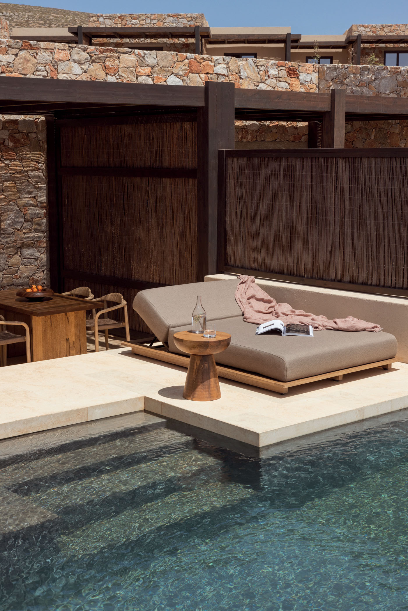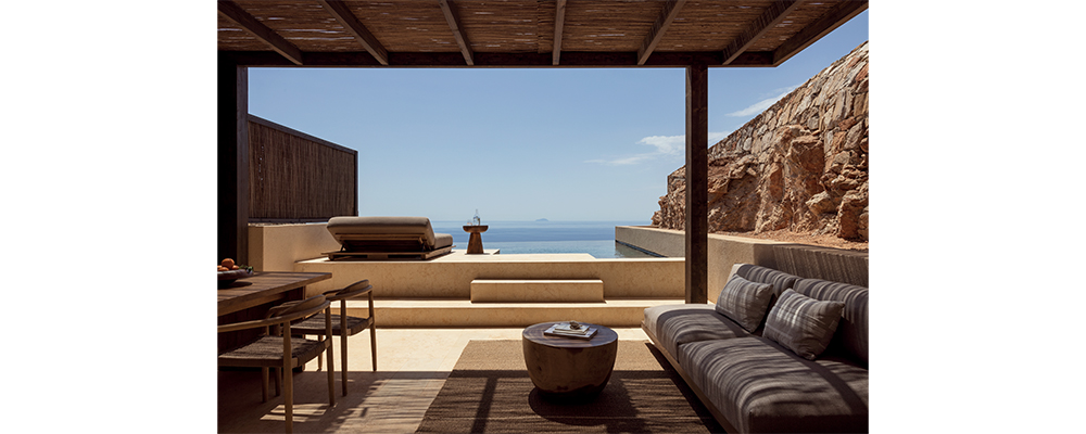 Reflecting on the resort’s island setting, Elena also revealed the challenges that faced Block722 during the five-year long project. She explained: “The original design brief was to create an eco-friendly resort that embodied a deep sense of responsibility towards nature, the unique Cycladic landscape, and the island’s rich cultural heritage. Building a resort on a small, secluded island presented a unique set of challenges that required careful planning and resourcefulness. Transporting materials, equipment, skilled workers, and craftsmen was a complex procedure, but our main concern was to preserve the natural beauty and have minimal impact on the landscape. The construction process had to cause minimal disruption to the local flora and fauna, as well as to the local community and culture.”