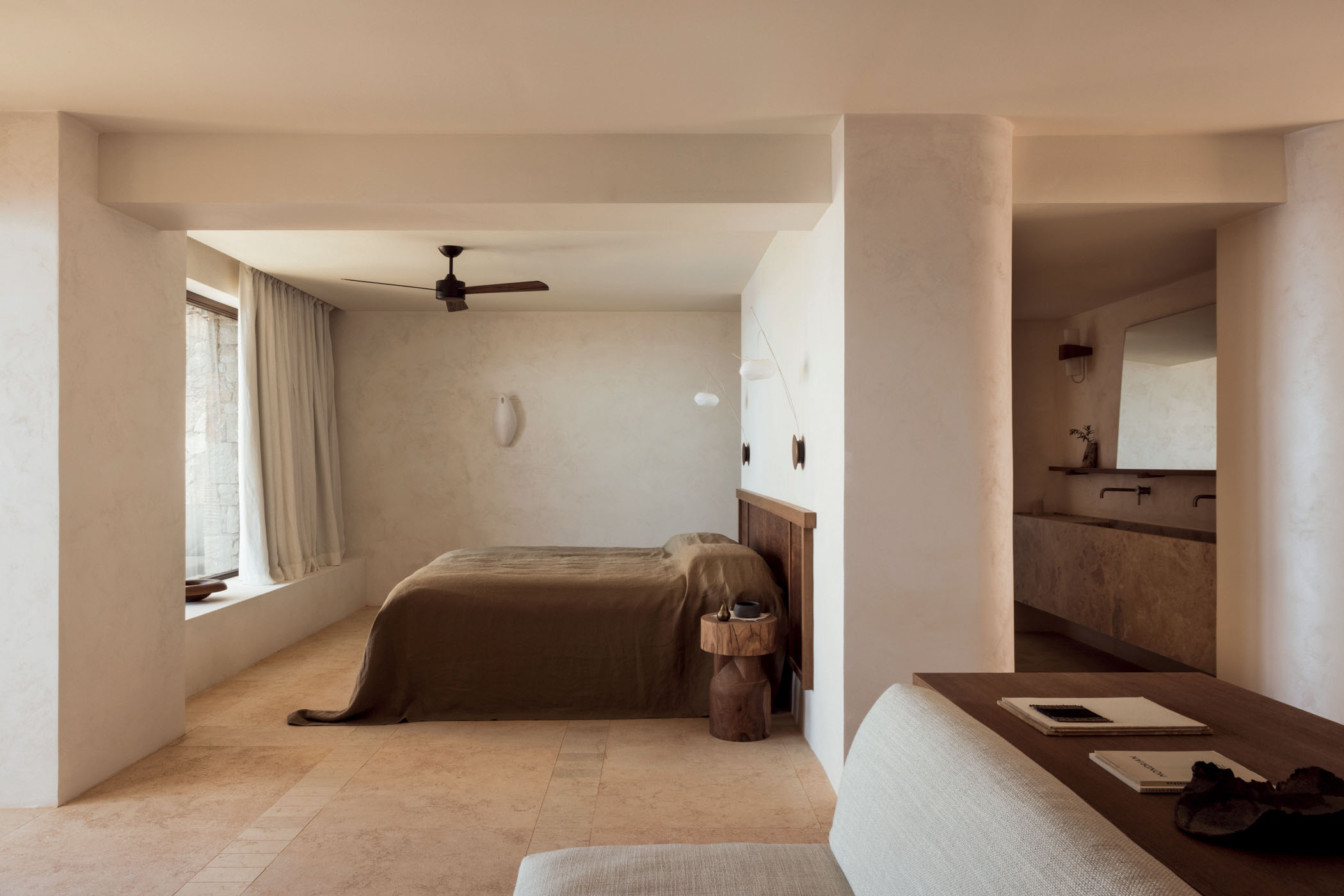 Stone, wood, clay and glass add texture and warmth to the scheme, and bespoke furniture – all designed in the studio – mingle with vintage finds. A curated collection of artworks, ceramics and music complements the ambiance.