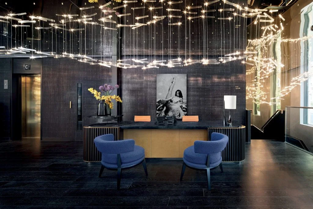 Tasked with the delivery of all Architecture and Interiors, were London based studio Woods Bagot, led by Brooke Radtke (interiors) and Davide Bertacca (architecture). “At the very start of the project, Davide and I flew to Berlin and spent a couple of days getting to know Ariel and the wider Amano team.” Brooke explained. “They are a smaller family run operator, so their approach was quite different to the bigger hotel chains. On numerous occasions we returned to Berlin and spent time with them in their hotels, bars and restaurants. This gave us first-hand experience of the warmth of hospitality the client offers.” Reflecting on the design choices, Brooke added, “This was the perfect brief and allowed us to better understand their values as a brand as well them as a client. In addition to bringing the AMANO brand in, we were able to draw inspiration from the local context of the surrounding theatre district. We added elements of drama and intrigue through feature lighting, art, mirror and reflections. We then added a dark and moody yet glamourous overlay through use of luxury materials
