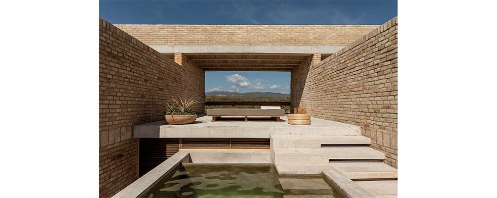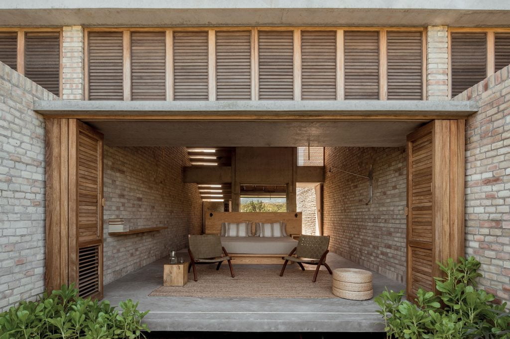 Guest accommodations take the form of 14 interconnected villas, each with their own private pool. Exteriors are defined by earth, brick, wood, and concrete, and when seen from inside, these elements are enhanced through the addition of clay and sand. The inherently earthy colour palette is used throughout the property and is complemented by custom furniture by Mexican designer Oscar Hagerman. This approach creates a harmony between the inside and out, helping to diminish any barrier typically placed between them. Slotted wooden doors and windows, for example, remove the need for glass.