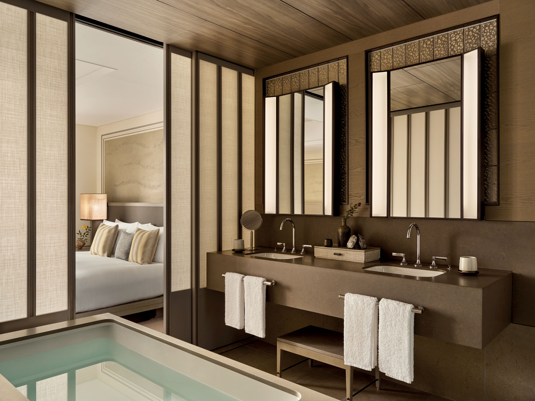 On floors six to 13, guestrooms and suites blend timeless Asian inspired interiors with contemporary European detailing. A strong focus on minimalism and symmetry encourages comfort and creates balance of energy. Large, floor-to-ceiling windows flood the rooms with natural light and provide stunning views of the city, landscaped gardens, or the iconic Tokyo Tower. Many rooms connect with neighbouring rooms and suites to create a seamless sense of belonging for groups and families travelling together. All have large bathrooms with double vanities, rain showers and bespoke soaking tubs.