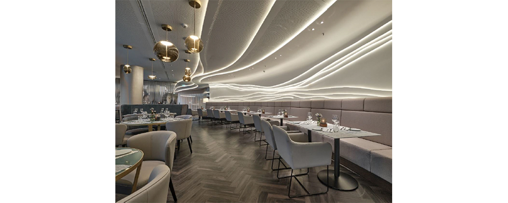 White finishes with a subtle shimmering lustre allude to the pearl, while fluid organic shapes now take on a different dimension by recalling the nacre age rings of the gem and its shell, as well as the waves of the passing fleet. The restaurant’s original stucco wall feature is honoured with sinuous strands of light newly embedded in the walls and ceiling. A room divider made from flowing metal ‘ribbons’ includes curves that create vantage points looking beyond the screen. Muted tone-on-tone colours create a tranquil ambience that encourages both hotel guests and locals to relax and recharge their batteries for their next adventures in the Hanseatic city of Hamburg.