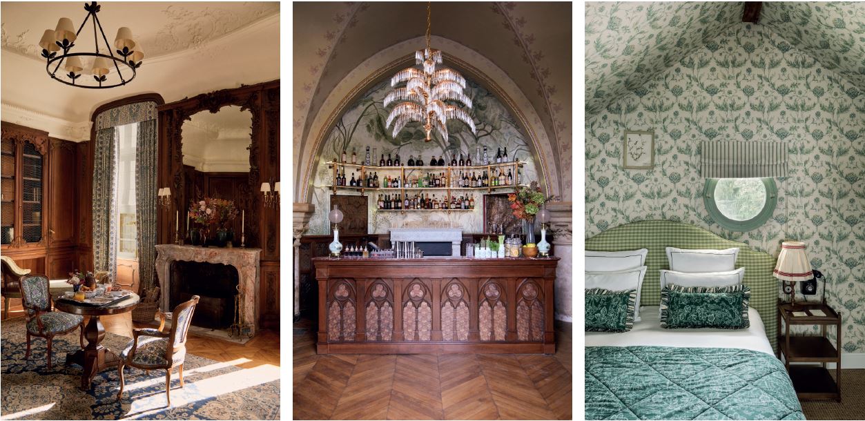 Drawing inspiration from the site’s rich history, you can endlessly wander from one space to another, where no two are the same. The eclectic mix of pattern creates a visual feast, telling stories of the past while weaving new narratives. The presence of French craftsmanship is evident at every turn, with collaborations from some of the world’s most renowned Maisons, such as Bernardaud for porcelain, Maison Pierre Frey for fabrics and wallpaper, and Maison Laval for joinery, to name but a few. De Castellane also lent her artistic touch, hand-sketching designs for fabrics and wallpapers adorned with woodland animals in the charming toile de Jouy style.