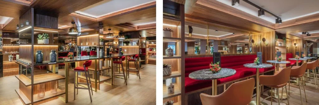 A sea change is immediately felt in The Level areas where the new design places velvet sofas in soft grey with wood painted in aquamarine. ASAH was seeking to create a chic London atmosphere with the addition of the little seen but much yearned for blue of the Mediterranean that was described by travellers such as Lord Byron.