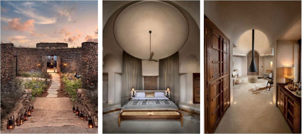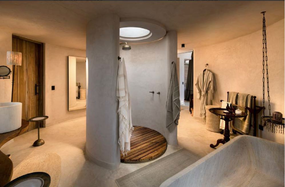 The villas feature domed ceilings in their living and bedroom spaces—an architectural homage to the forms of the surrounding rock sanctuary—while the bathrooms offer expansive views, deep stone bathtubs, circular skylit showers, and even a “loo with a view.”
