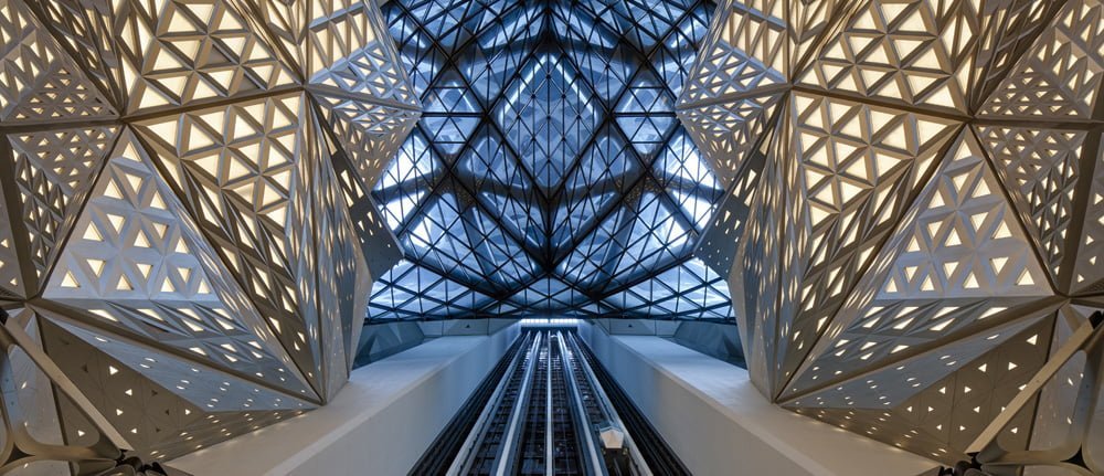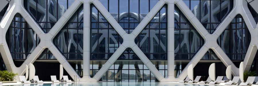 Zaha Hadid Architects was commissioned to build the hotel in 2012, making it one of the last projects designed by Zaha Hadid herself. After her death in 2016, the project was finished by her architecture firm, with Viviana Muscettola taking over the role of project director. Building works began on the site using the existing foundations for a condominium tower that didn’t progress beyond ground level. 28,000 tons of steel were used to construct the supportive exoskeleton and all the hotel’s exterior panel fabrication was procured locally to make use of local expertise and equipment.
