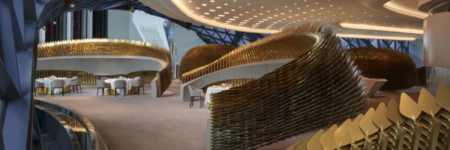 The shaping of the building’s skeleton was inspired by the fluid forms within China’s traditional jade carving, giving the Morpheus a combination of dramatic public spaces and generous guestrooms with innovative engineering and formal cohesion. Conceived as a vertical extrusion of its rectangular footprint, a series of voids is carved through its centre to create a connection between the hotel’s interior communal spaces and the city. The exoskeleton leaves an impression on the interiors as well as the exterior by creating spaces that are uninterrupted by supporting walls or columns.