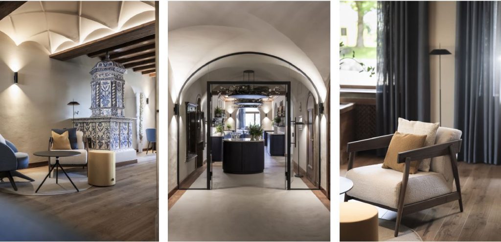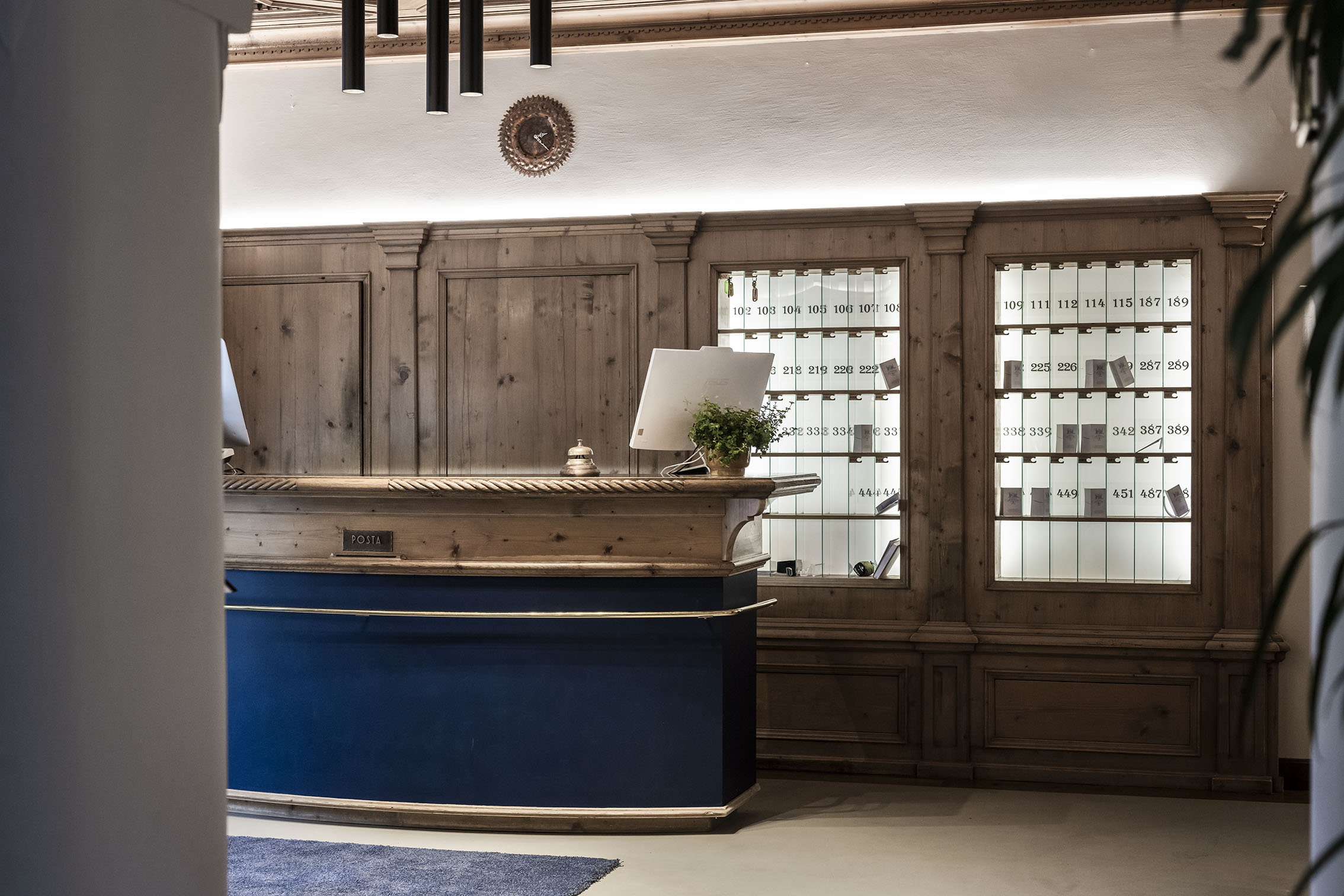 “The interiors are a journey through different eras. The two magnificent ceramic stoves set the mood for the colour palette, especially regarding the contrasting shades. Their decorative designs feature an elegant blue-grey hue, which we also applied to the fabrics and paired with touches of yellow, giving the lobby a relaxed and contemporary atmosphere,” states architect Maddalena Gioseffi.