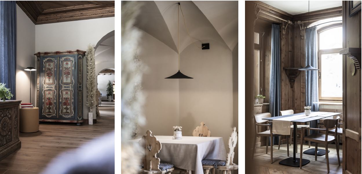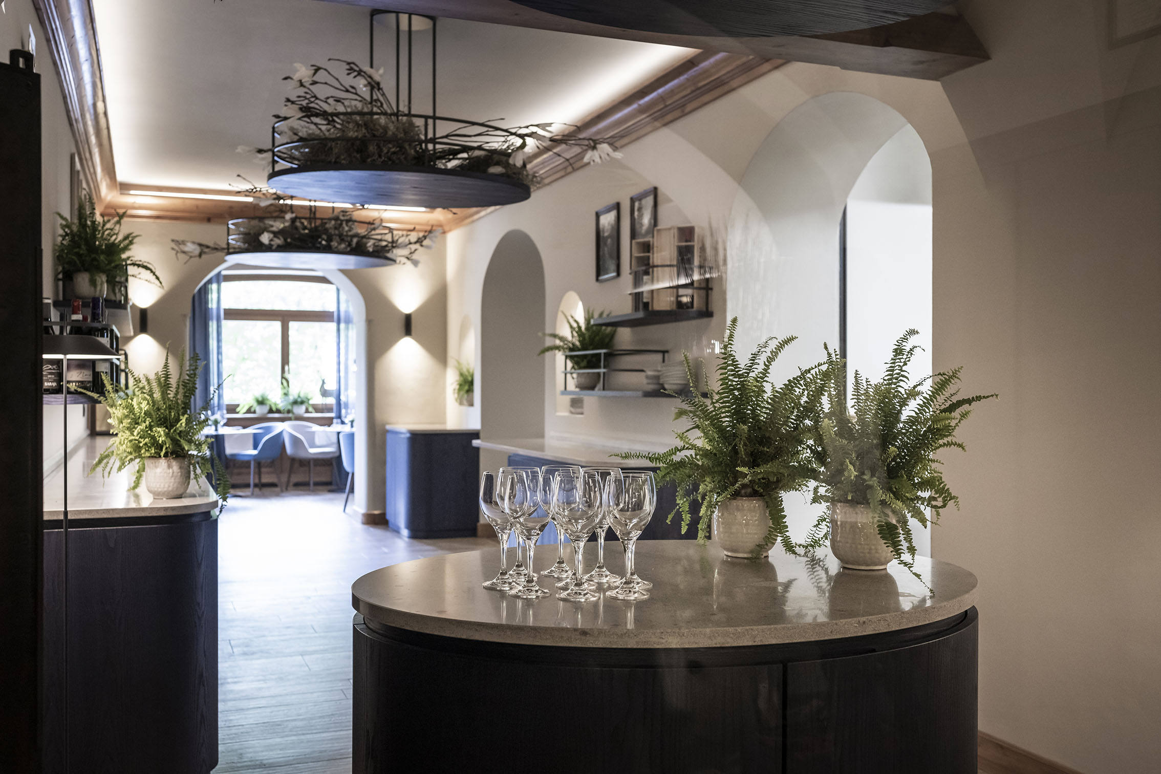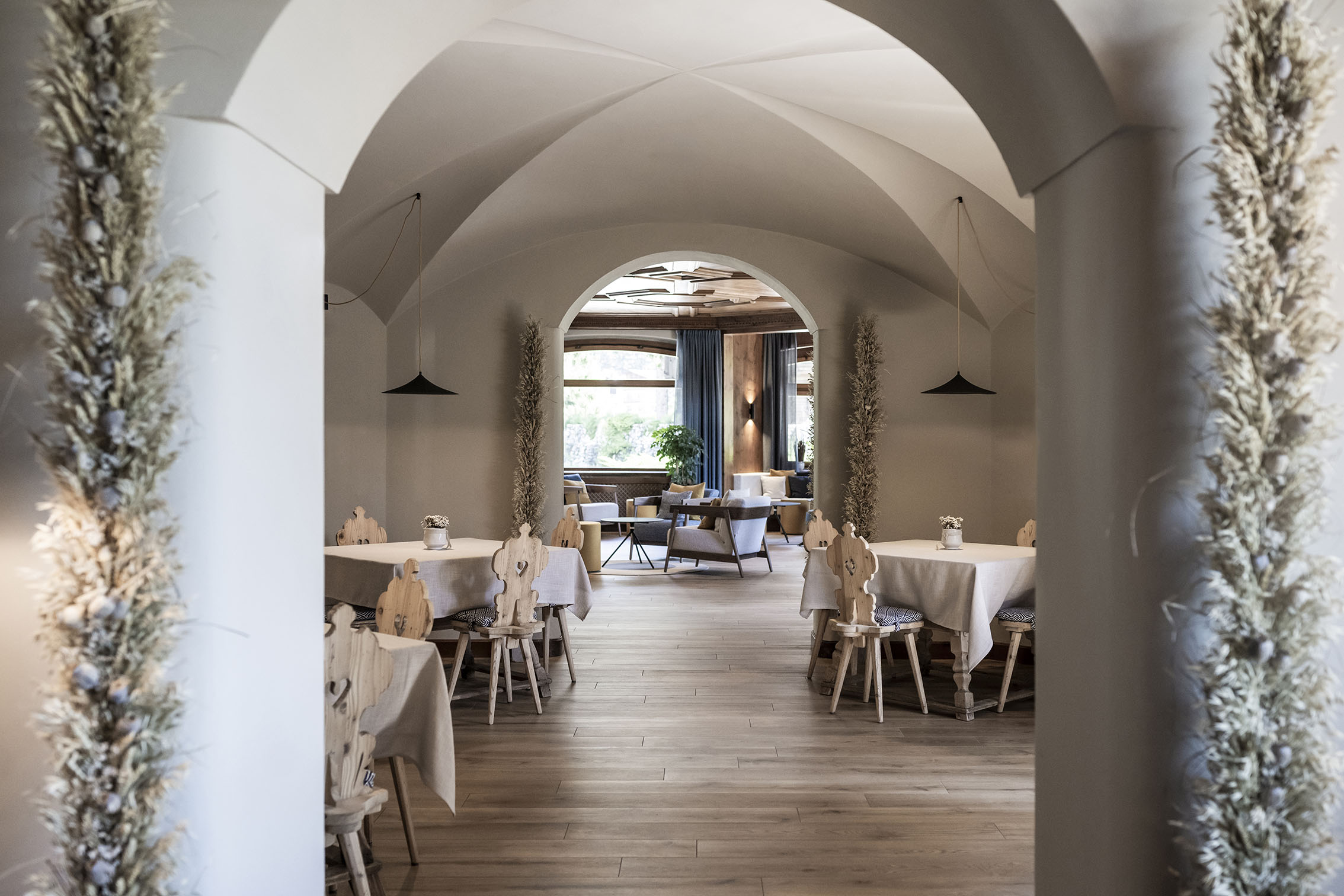 The reception area, dominated by the historic desk with an integrated mail slot, remains the central space across the building but has been refreshed with new resin flooring that completely updates its appearance. From here, guests can easily access the right wing, where the bar, stube (living area), and salon are sequentially located, or the left wing, which houses the breakfast buffet, the restaurant with three dining rooms, the kitchen, and the management offices.