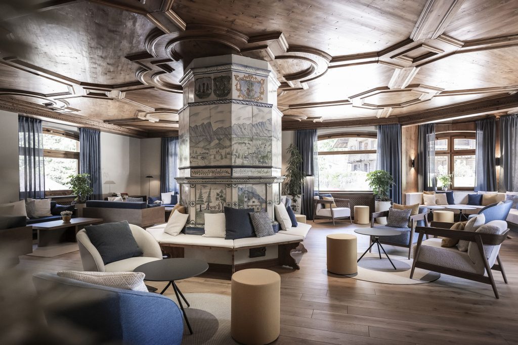 Past the reception area and to the right is the bar room. Comfortable seating from Gervasoni and Innova Imbottiti is arranged around the stove and beneath an elaborate vaulted ceiling, while a single row of tables is placed parallel to the large windows overlooking the surrounding peaks, accentuated by pendant lamps. In the adjacent stube, the traditional rustic Alpine chairs have been retained. The beating heart of the new ground floor is the large salon closing off the right wing, featuring an elegant coffered ceiling and expansive windows that establish a visual connection with the hotel’s park.