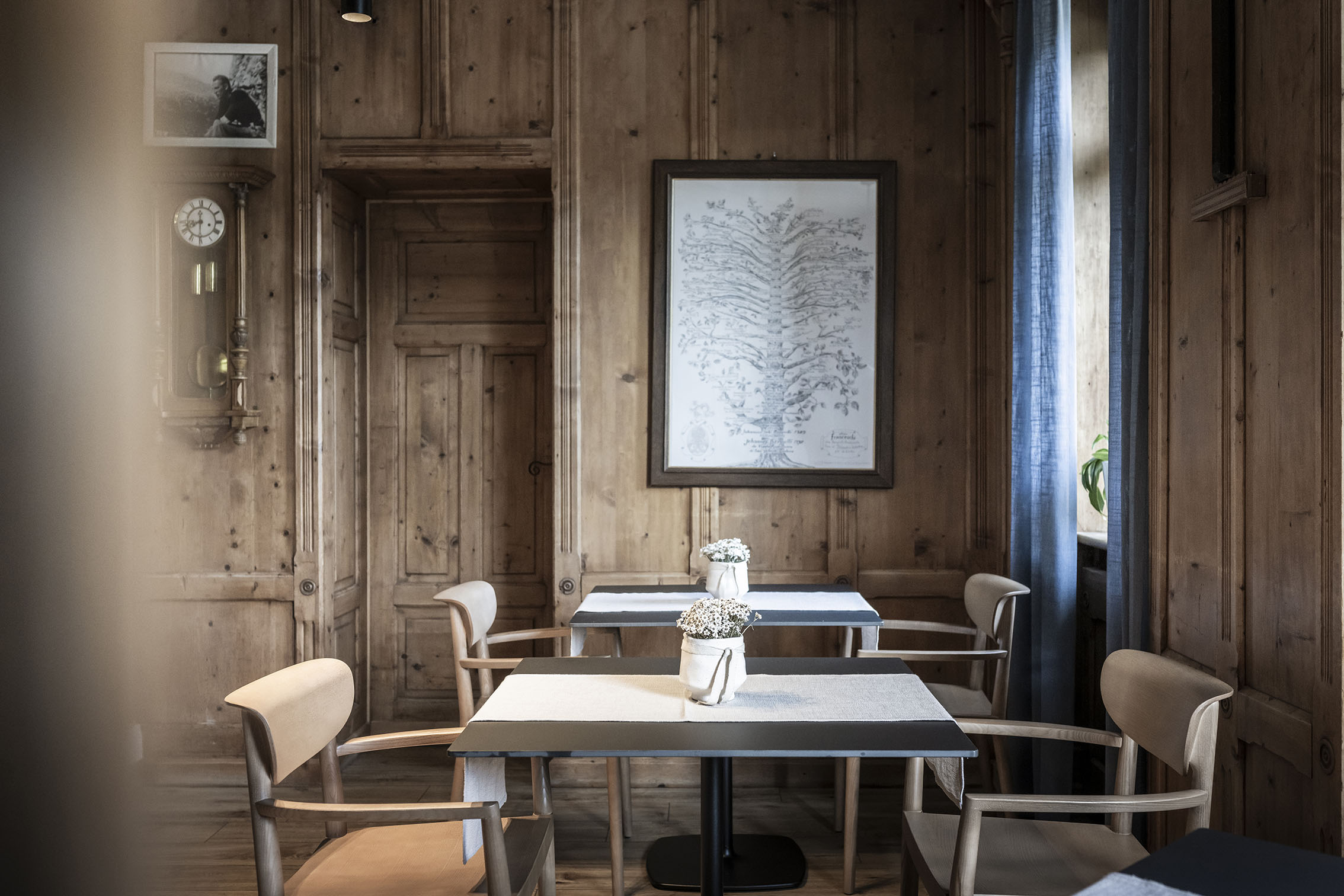 “This is a space we treated individually, aiming to highlight its historical charm. The wooden Pedrali chairs, the tables, and the black tubular pendant lights represent a sophisticated modern touch in this ‘stube’, where the family tree of the Franceschi family, dating back to 1289, is prominently displayed on the walls. An authentic piece of Cortina’s history,” concludes Maddalena Gioseffi.