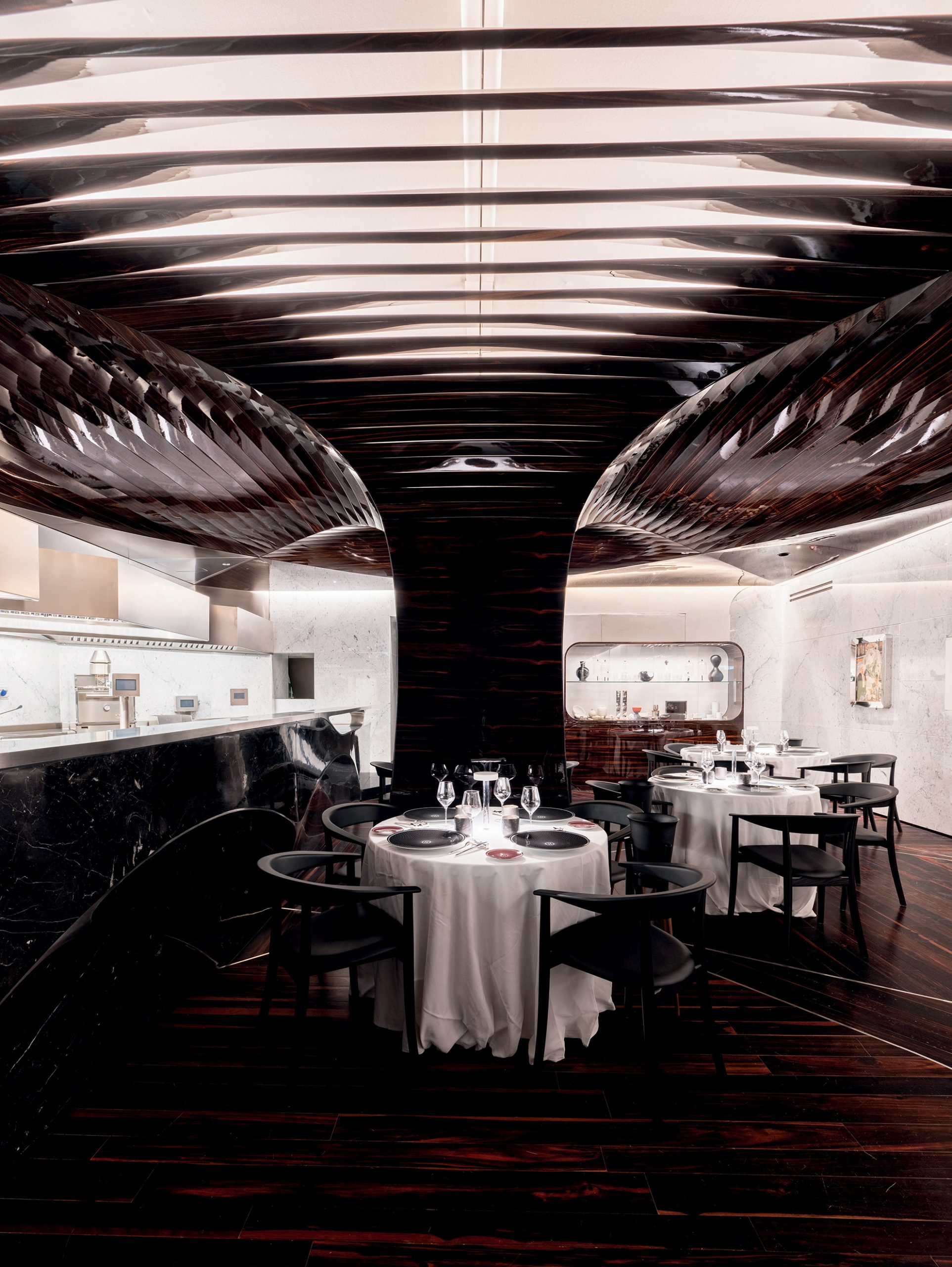 While the overall design bears the unmistakable vision of Hadid, the ebony finish marks a departure from the bright white interiors she was best known for.
