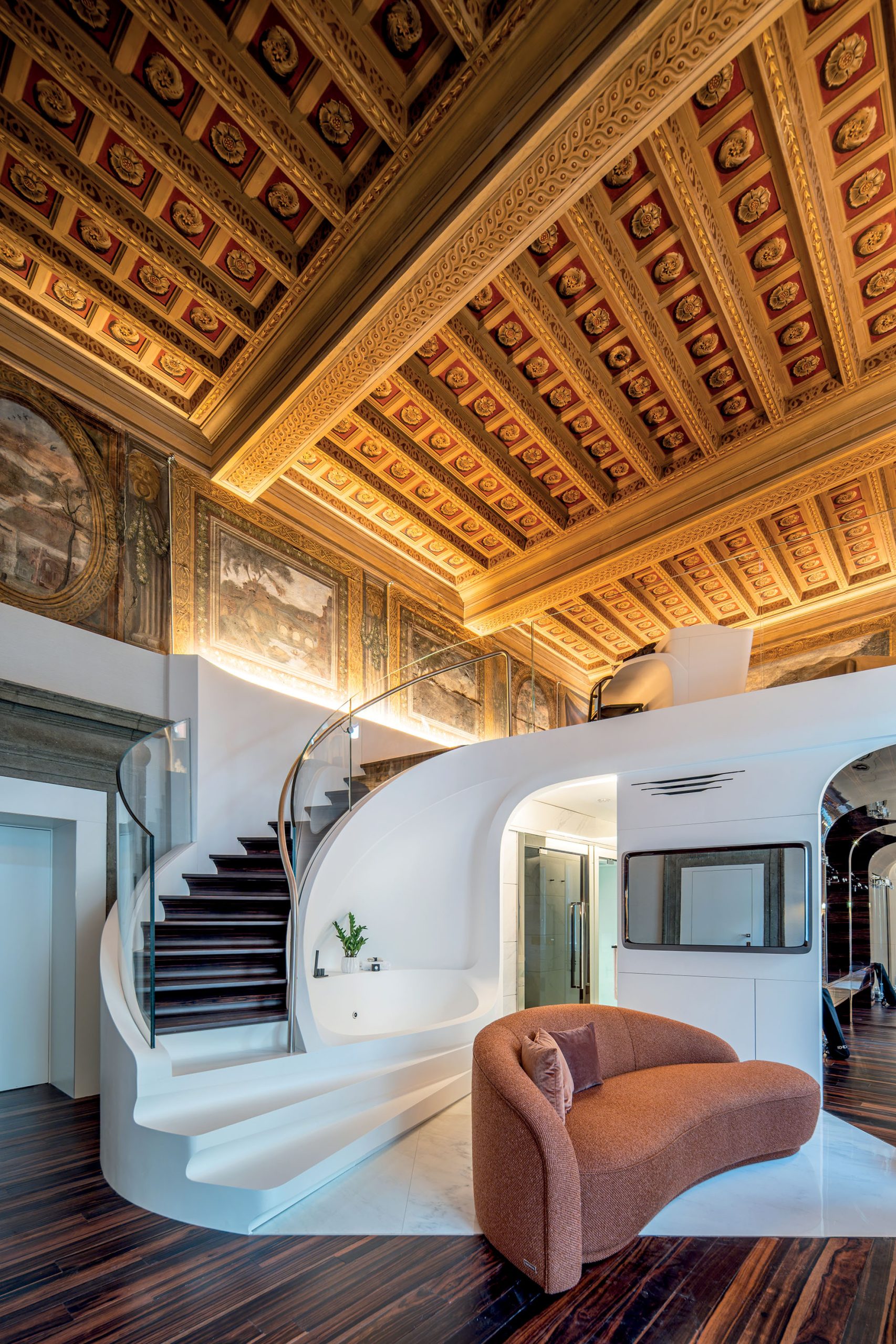 From the central lobby, a marble staircase leads up to the aptly named ‘Fresco Suites,’ the last remaining rooms of the original Piazza. In the suite we are shown, ancient frescoes wrap around the walls, depicting a variety of vistas. They are stunning and, surprisingly, unprotected – the owners preferring to trust their guests rather than install glass panels. The high ceiling allows for a sweeping staircase to wind its way up to a mezzanine bedroom, its curve continuing down to embrace a sculptural bathtub. In the real world, its placement might raise eyebrows, but here – where apparently anything goes – it somehow works. The juxtaposition of old and new reaches a heady climax with the ebony Hadidist curves enveloping the bathroom, dressing room, and kitchen area, like a capsule.