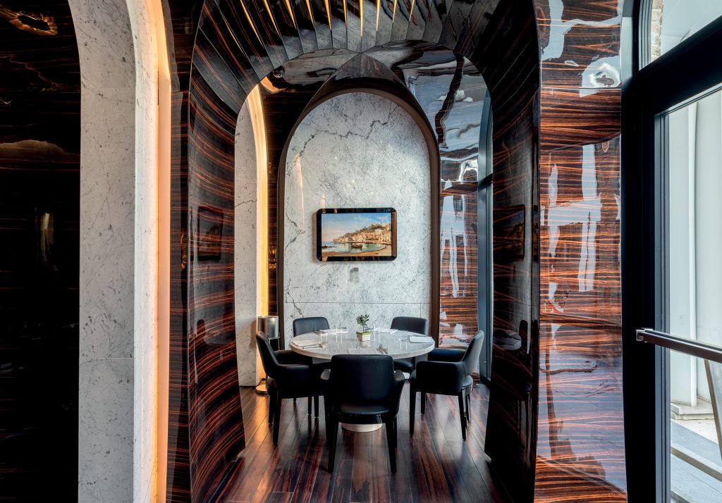 The Lobby, once the Piazza’s courtyard, connects the three buildings under a canopied structure of stainless-steel spines. Standing at its centre, Ivan Russo, ROMEO Group’s Director of Architecture, admires his work. “This is the beauty of the hotel,” he tells me. “The structural challenge here was to bring everything to the same level to accommodate all the guest areas – the restaurants, the bar, the spa etc – so we could reduce the flow of traffic on the guest room floors above.” This is just as well, given the marble and hardwood ‘carpets’ in the corridors above, where passing guests are heard – if not seen. But back on the ground floor, the design works well, with each space flowing seamlessly into the other, through deep Carrara marble archways. And upstairs, the passing guests are indeed, few and far between.