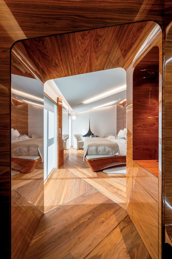 While the overall design bears the unmistakable vision of Hadid, the ebony finish marks a departure from the bright white interiors she was best known for. “Initially, she was resistant to the idea of ebony,” Russo tells me. “For one, she couldn’t comprehend the cost of using it in such vast quantities. She also doubted the design could be executed in wood, insisting it could only be achieved with a manmade material. But Romeo was insistent, and eventually, she agreed to experiment with the ebony.”