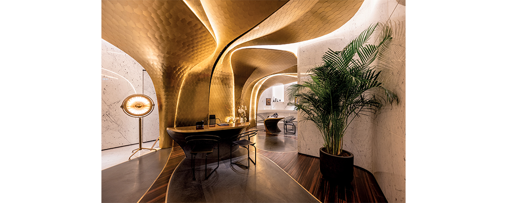 Offering the first taste of the rich materiality that flows throughout the hotel is the reception. Here, huge plant-like structures rise up from the floor, clad in a clamshell pattern of shimmering brass tiles. Casting shards of light that illuminate the amorphous desks below, they shine like beacons against walls of Carrara marble. Underfoot, islands of slate float on a sea of ebony edged with inlaid gold. It’s an exciting start to the drama that follows.