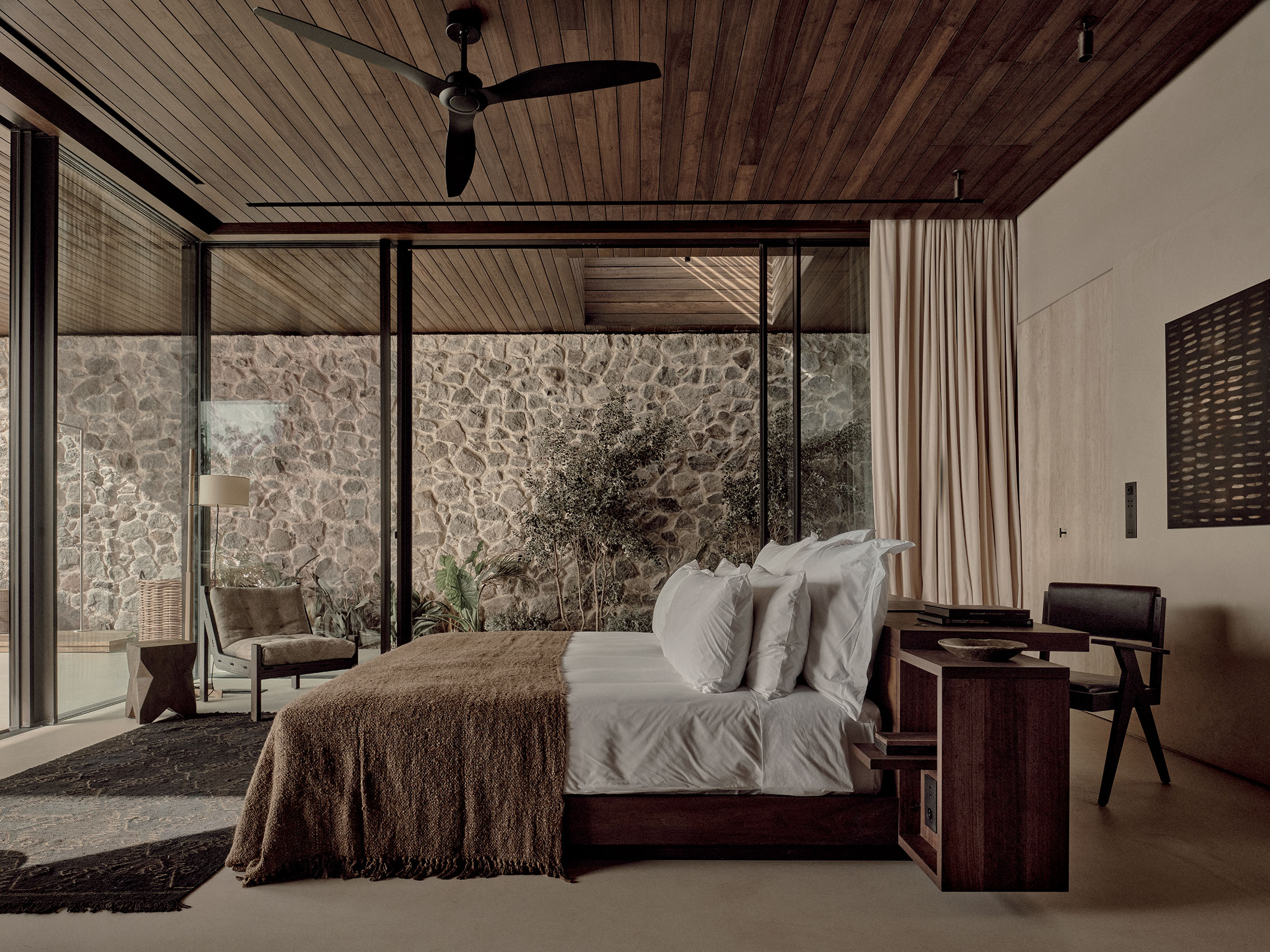 Scorpios Bodrum features a traditional grand villa setting for conversations late into the night, unique Ritual Space and 12 private bungalows. Developed by architecture studio GEOMIM, with interiors by Berlin-based Lambs and Lions and StudioMacBride, in collaboration with Annabell Kutucu, the design combines local authenticity and international luxury. The use of design elements and cultural references from all over the world represent the wandering spirit of the Scorpios community. Attention to materials, natural colour palettes and bright interiors that spill into expansive outdoor areas all characterise an atmosphere of contemplative ambience. Locally sourced materials bring a sense of harmony with the natural surroundings. There are thick stone walls, inspired by traditional Aegean villages, and wooden canopies and adjustable shutters. Green roofs and gardens help blend interior and exterior areas while promoting biodiversity.