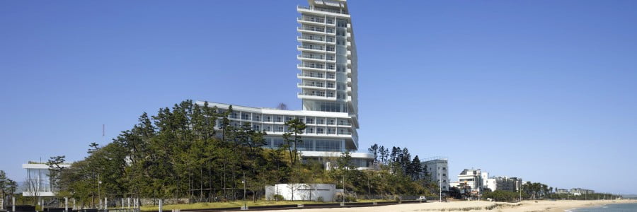 Composed of two main buildings and supporting facilities nestled into a hill of dense pine trees, Seamarq Hotel in Gangneung, South Korea, overlooks the East Sea, Gyeongpo Lake and the Taebaek mountains. The former Hyundai Hotel Gyeongpodae, now known as Seamarq Hotel, has been rebuilt as part of a revitalisation of the region in preparation for the 2018 Winter Olympics in PyeongChang, South Korea.