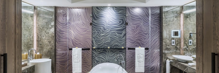 Comfortable space in the bathroom of the Junior suite allows for a freestanding bath to be the centre of guest’s attention in front of the over-sized shower room. Flashes of black is met by striking purples to create a relaxing private area.